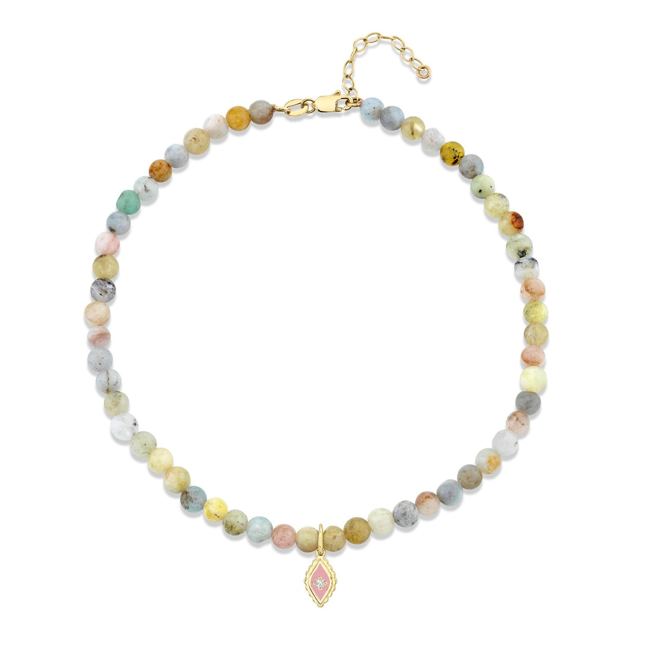 This refined anklet exudes timeless elegance, featuring a 14k yellow gold fringe charm delicately adorned with sparkling diamonds and a soft blush enamel finish. The charm, measuring approximately 3/8″ x 1/4″, represents both movement and grace, its fringe design evoking the flowing beauty of nature and the energy of the elements. Set on 4mm multi-morganite beads, the anklet exudes warmth and tranquility, with morganite known for its association with love and compassion. The anklet measures approximately 10.5″ in total length, including a 1″ chain extender, offering a perfect balance of sophistication and versatility.