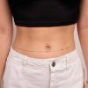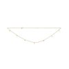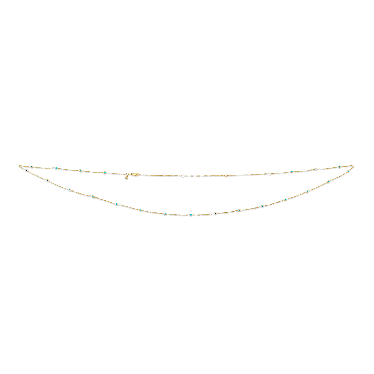 14k yellow gold belly chain features 22 mini enamel protective eyes. The belly chain is 32″ long with extenders at 26″, 28″ and 30″.
