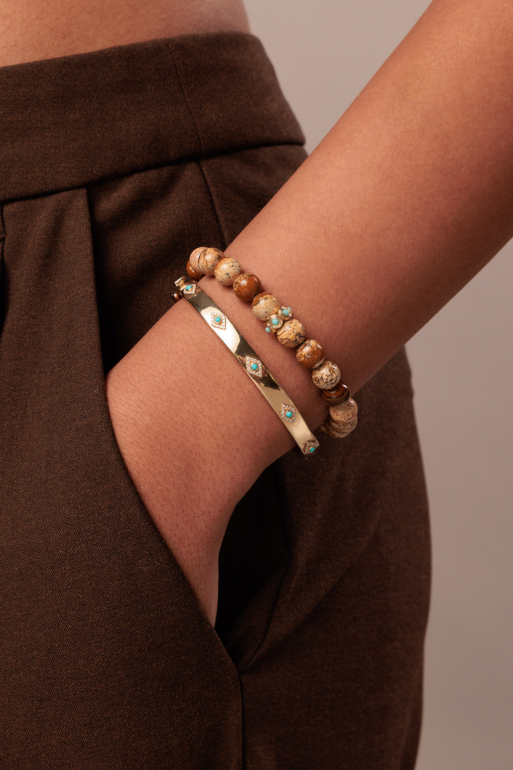 This captivating 14k yellow gold bangle bracelet features a striking multi-protective-eye design, each eye adorned with a vibrant turquoise stone at its center. A timeless emblem of protection and spiritual awareness, the protective eye motif symbolizes warding off negative energy while inviting positivity and balance. The turquoise stone, revered as a talisman of serenity and healing, adds a meaningful touch to this elegant piece.