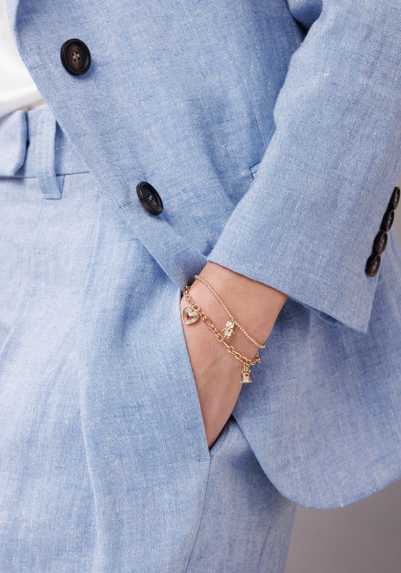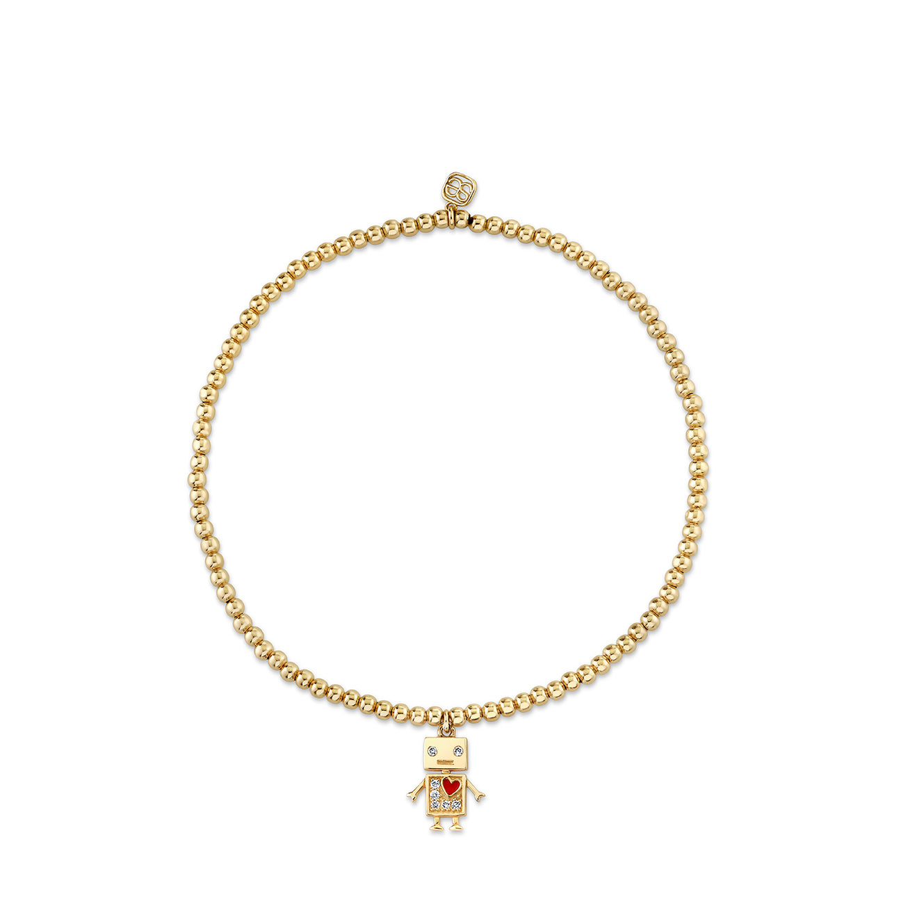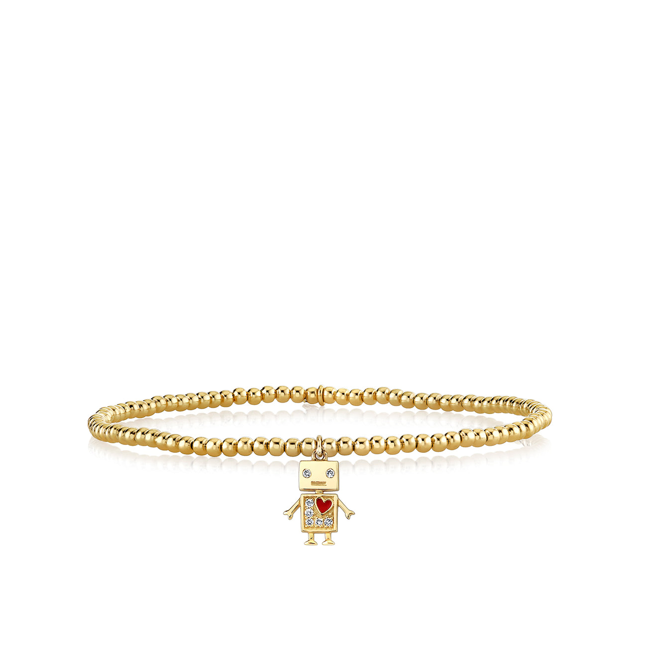 This bracelet features a charming 14k yellow gold baby robot, symbolizing a blend of modern technology and innocence, with a heart of red enamel to represent love and warmth. The delicate diamond accents on the robot add a touch of sparkle, symbolizing purity and brilliance. The charm is strung on a 2mm 14k yellow gold bead bracelet, offering a refined, understated elegance.