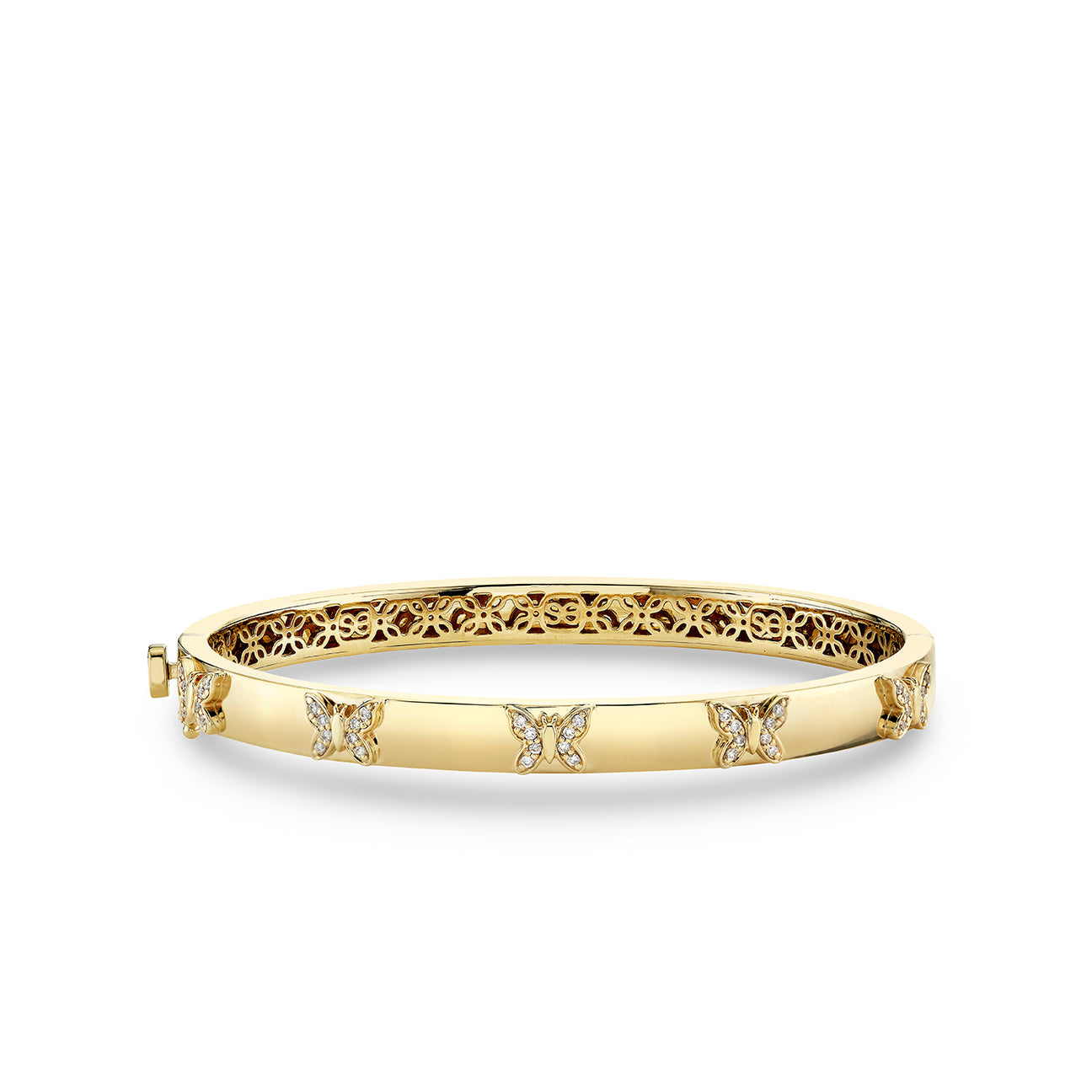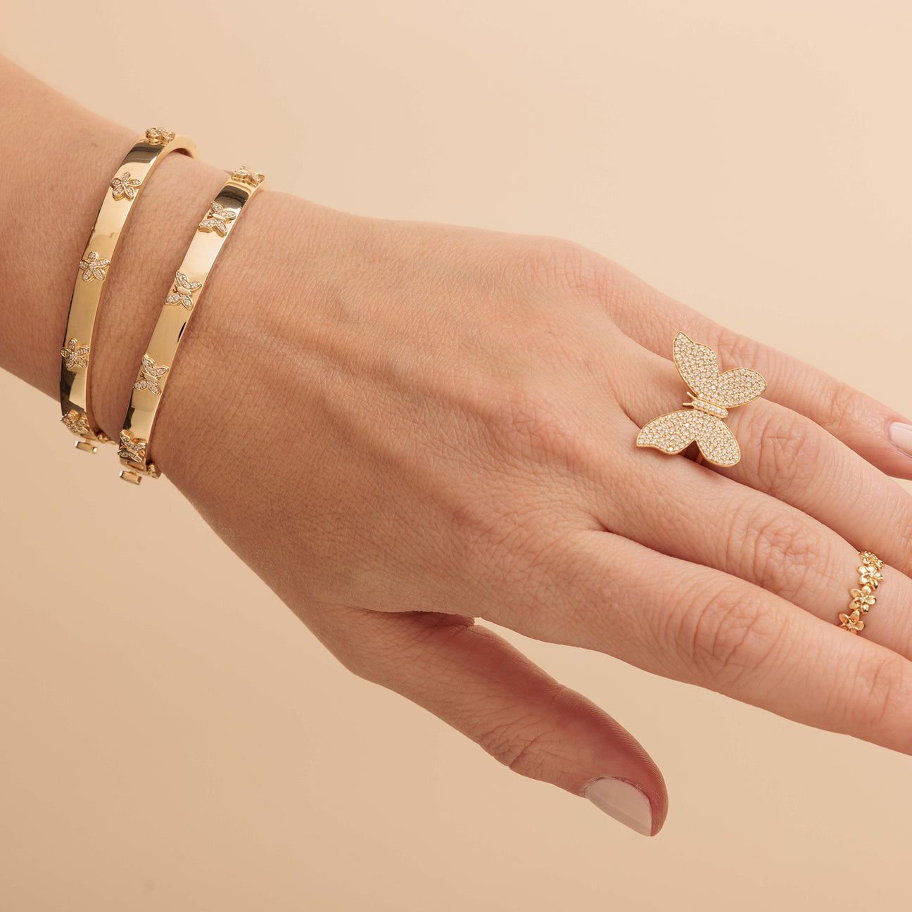 This enchanting 14k Yellow Gold Multi-Butterfly Bangle captures the delicate beauty of nature and the transformative symbolism of butterflies. Featuring five diamond-accented butterflies gracefully perched on one side, this bracelet celebrates metamorphosis, renewal, and the beauty of life’s fleeting moments.