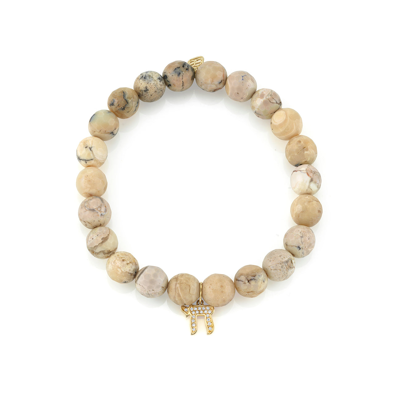This stunning bracelet features a 14k yellow gold and diamond chai charm, a symbol of life and vitality, beautifully suspended on a strand of 8mm smooth round African Opal beads. The opal, known for its captivating play of colors, is believed to inspire creativity and amplify emotional healing. The charm measures approximately 3/8″H x 1/4″W, delicately crafted to symbolize the enduring strength of faith. The bracelet is strung on a durable stretch cord and adorned with a 14k SE logo charm, ensuring both elegance and wearability. Each piece is unique, with slight variations in bead color and shape, reflecting the natural beauty of the precious and semi-precious stones. The standard size is approximately 6.25″, with custom sizing available upon request.