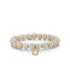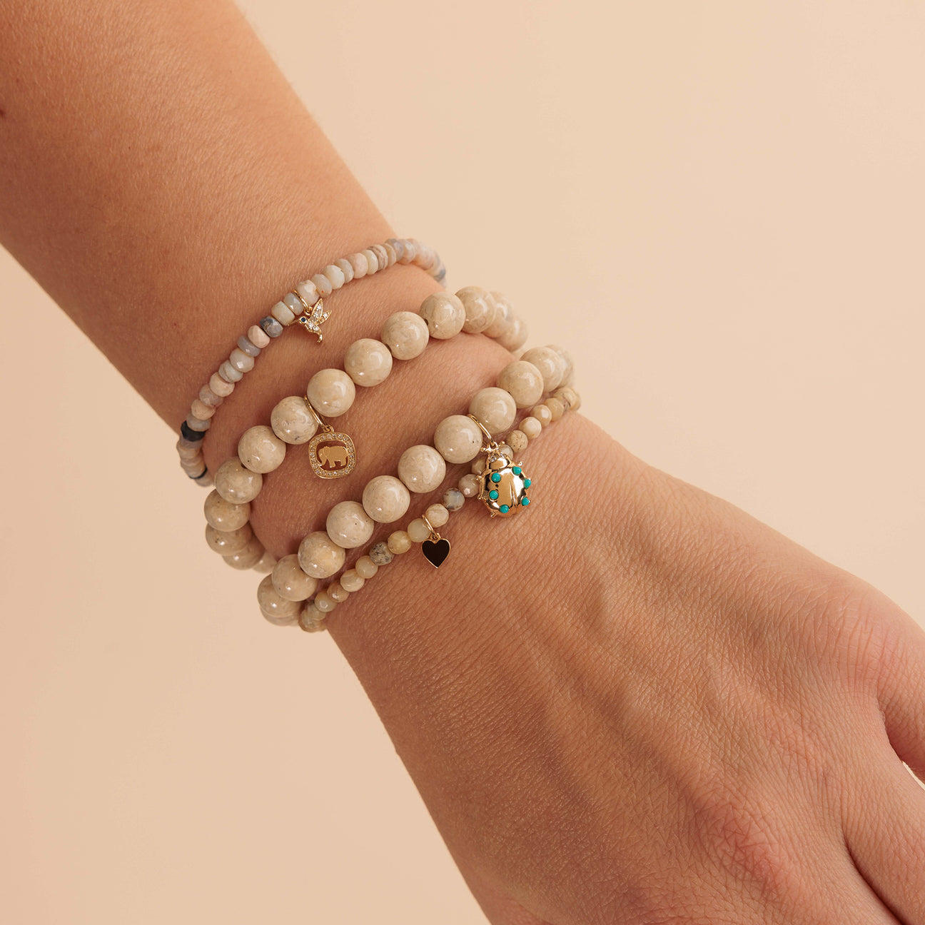 This elegant bracelet features a 14k yellow gold and diamond elephant open icon charm, a symbol of strength, wisdom, and good fortune. Elephants are revered in many cultures as a symbol of protection and longevity, making this piece not only a beautiful accessory but a meaningful talisman. The charm rests gracefully on a strand of 8mm round cream jasper beads, a stone known for its calming and grounding properties. Measuring approximately 1/3″ in diameter, the charm adds a delicate yet impactful touch to the design. All Sydney Evan beaded bracelets are strung on a stretch cord, complemented by our signature 14k gold SE logo charm. The standard size is approximately 6.25″, but custom sizing is available upon request.