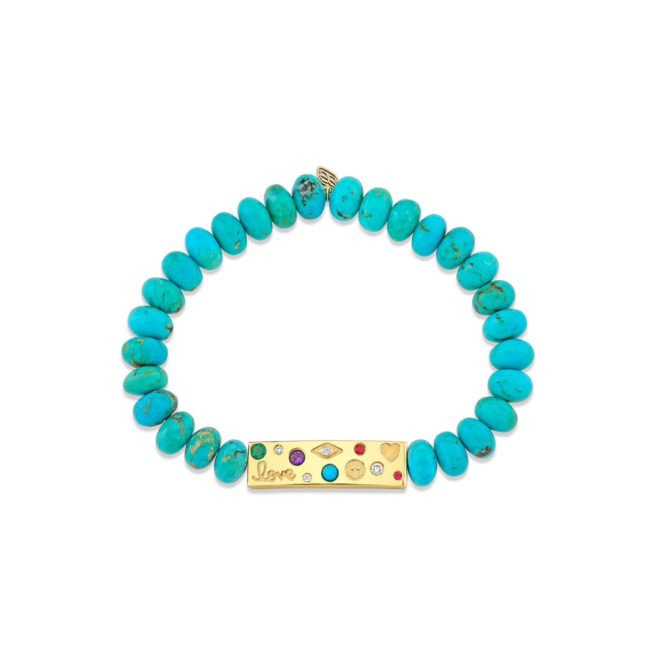 Handcrafted with care and attention to detail, this Gold & Diamond Iconography Bar on Turquoise is a true work of art. It is the perfect gift for yourself or a loved one, and will surely become a treasured piece for years to come. All Sydney Evan beaded bracelets are strung on a stretch elastic cord along with our 14k gold SE logo. Beads color and shape may vary slightly due to the nature of the precious and semi-precious stones. Standard size is approximately 6.25′, for all custom size requests, please contact us.