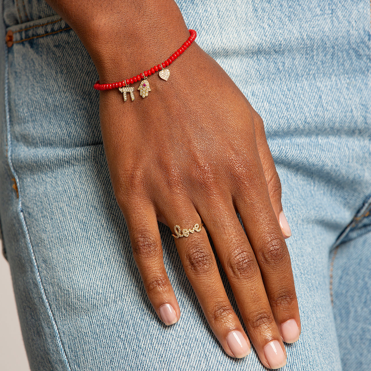 Celebrate the powerful energies of love, life, and protection with this elegant 14k gold and diamond multi-charm bracelet, delicately strung on vibrant 3mm red bamboo beads known for their natural warmth and grounding properties. This meaningful bracelet features three iconic Sydney Evan charms, each symbolizing a unique blessing: