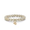 The charm rests on a strand of smooth, 8mm round cream jasper beads, known for their nurturing energy and grounding properties. The bracelet is hand-strung on a stretch cord and finished with our signature 14k gold Sydney Evan logo charm.