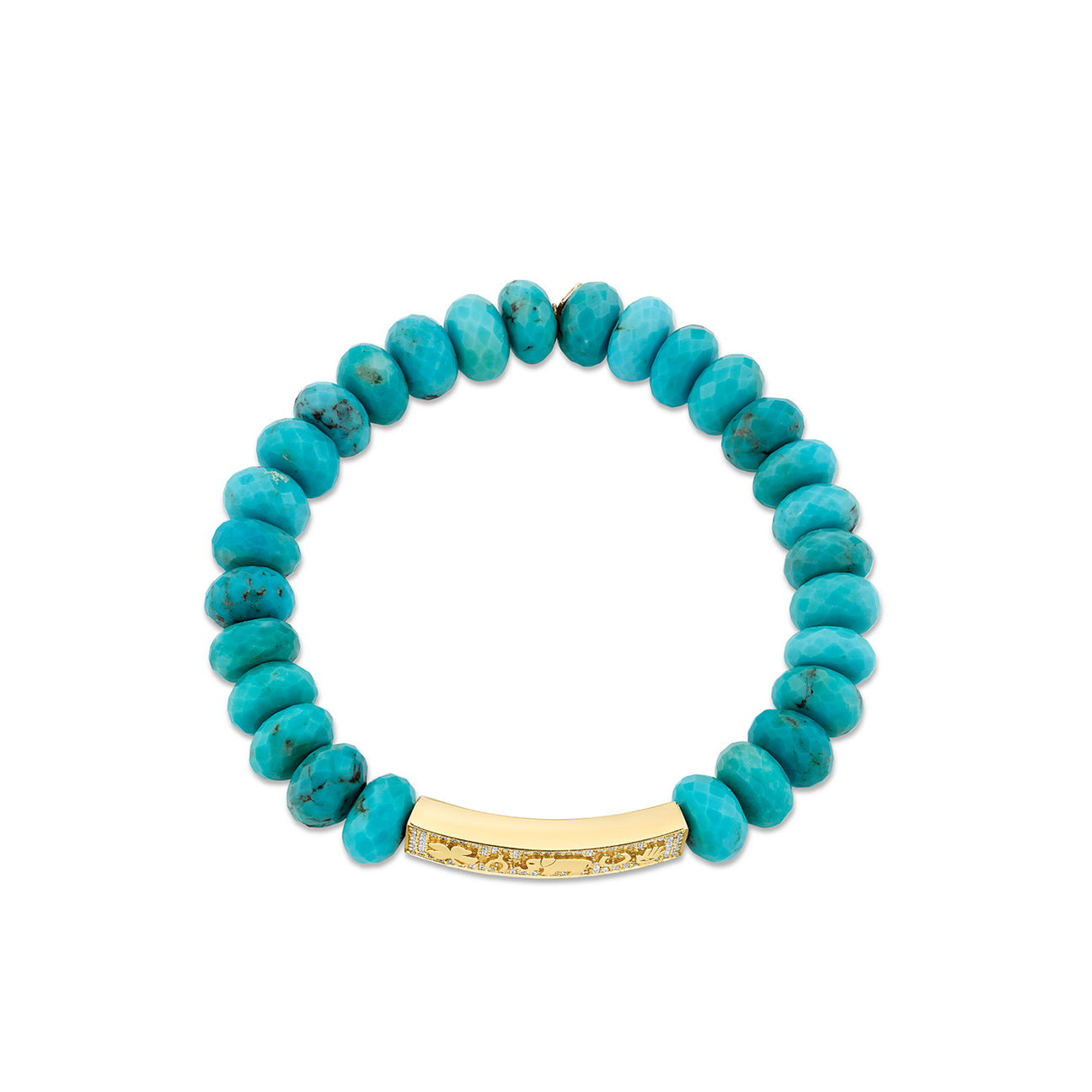 Invite positivity and protection into your everyday style with this vibrant 14k yellow gold and diamond Luck Tableau bracelet. Set on a strand of 8mm natural turquoise beads—known for their calming and protective energy—the pavé diamond-accented tableau charm measures approximately 1/4″ H x 1″ W and features an artful arrangement of lucky symbols for good fortune and guidance.