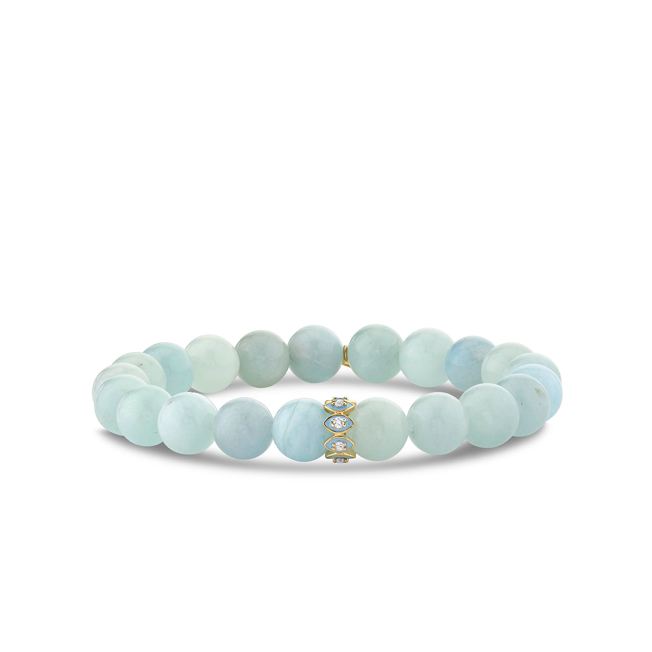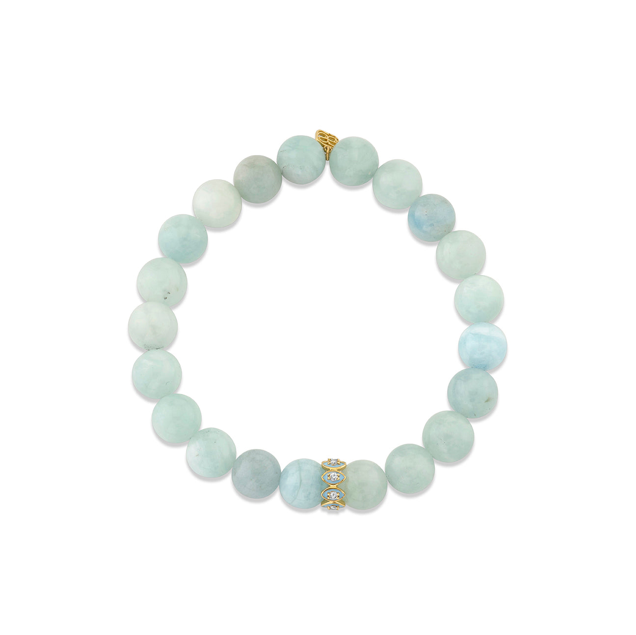Made with 14k yellow gold, this unique piece features a marquis eye rondelle adorned with sparkling diamonds and cornflower blue enamel. The smooth 8mm aquamarine beads add a touch of elegance and sophistication, while the stretch cord ensures a comfortable fit.