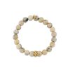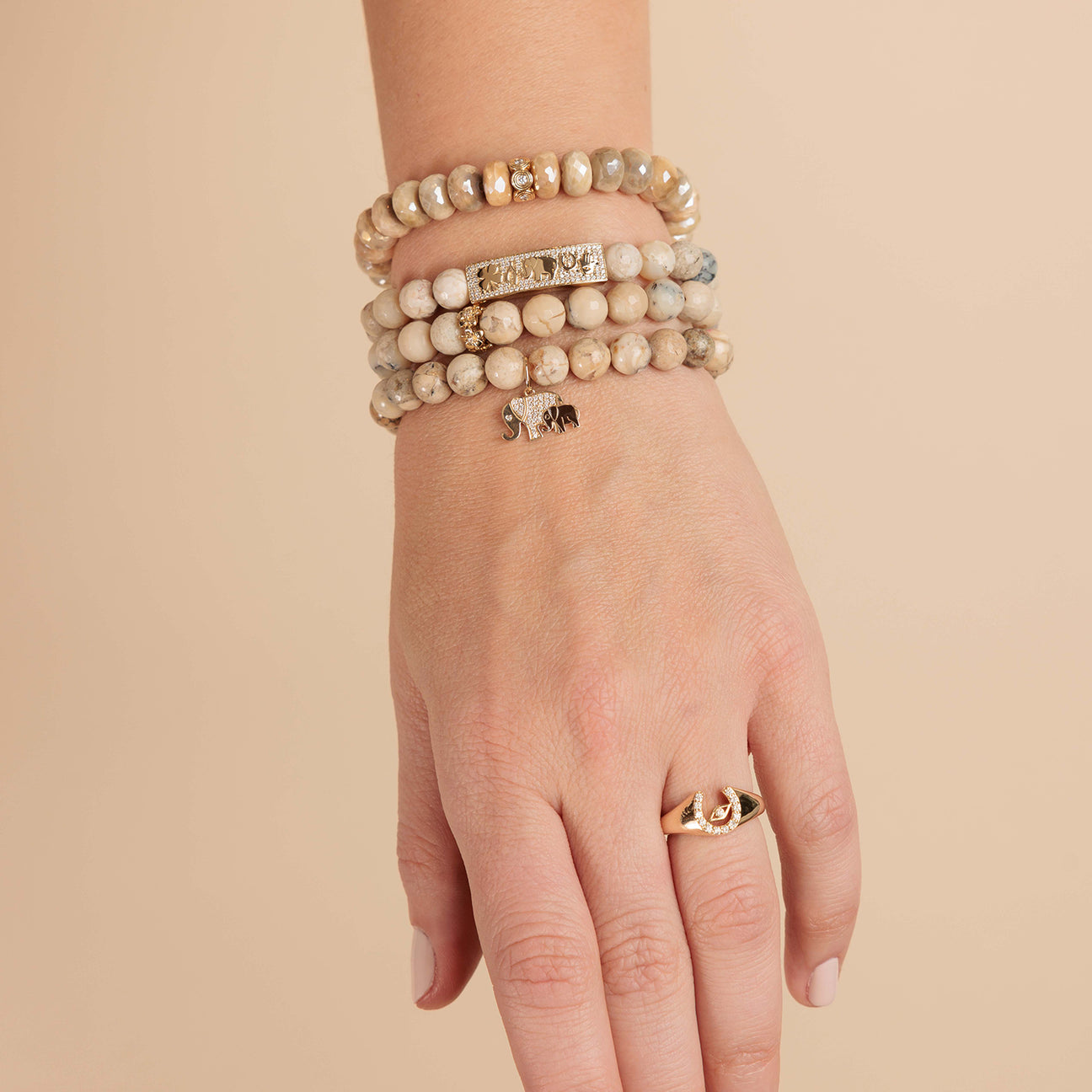 14k yellow gold and diamond 8mm plumeria flower rondelle on 8mm African opal beads. Rondelle measures approximately 1/8″W x 3/8″H. All Sydney Evan beaded bracelets are strung on a stretch cord along with our 14k gold SE logo charm. Beads color and shape may vary slightly due to the nature of the precious and semi-precious stones. Standard size is approximately 6.25″, for all custom size requests, please contact us.|+Care Instructions