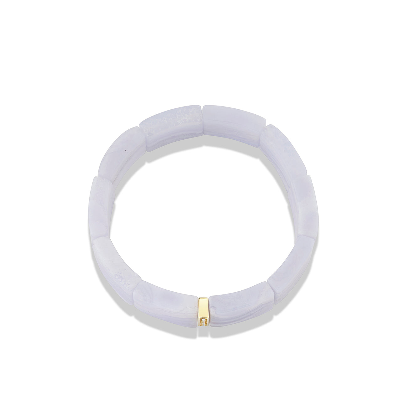 Crafted from 14k gold, this bracelet features bold 12mm rectangular Blue Lace Agate beads, each with natural marbled patterns that add quiet movement and texture. A small single row pavé spacer brings a refined touch of sparkle, offering contrast to the stone’s cool, tranquil tones. This bracelet brings together softness and structure with understated elegance.