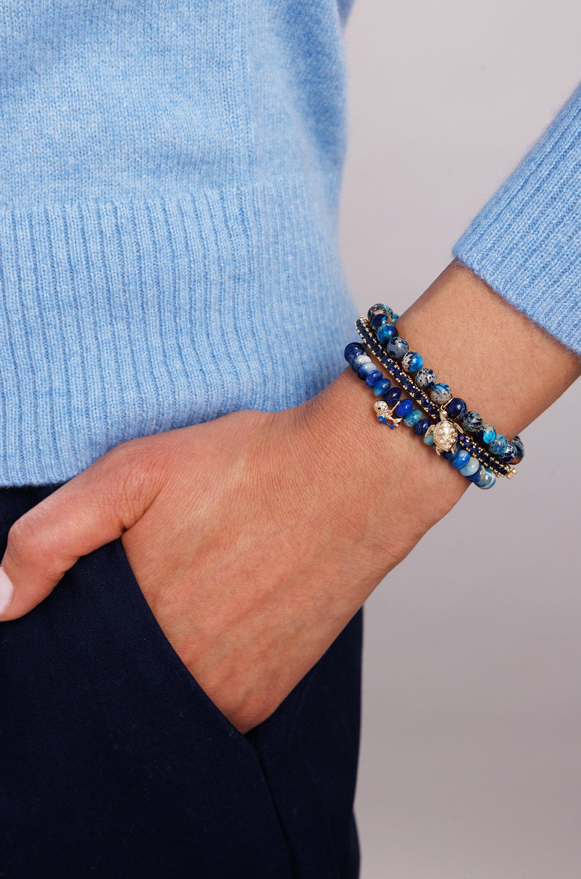 This stunning bracelet features a unique combination of 14k yellow gold and diamond turtle charm on a bracelet made of 6mm smooth ocean blue sea sediment jasper beads. The charm itself measures approximately 1/2’W x 1/2’H, adding a touch of elegance and sophistication to the overall design.