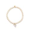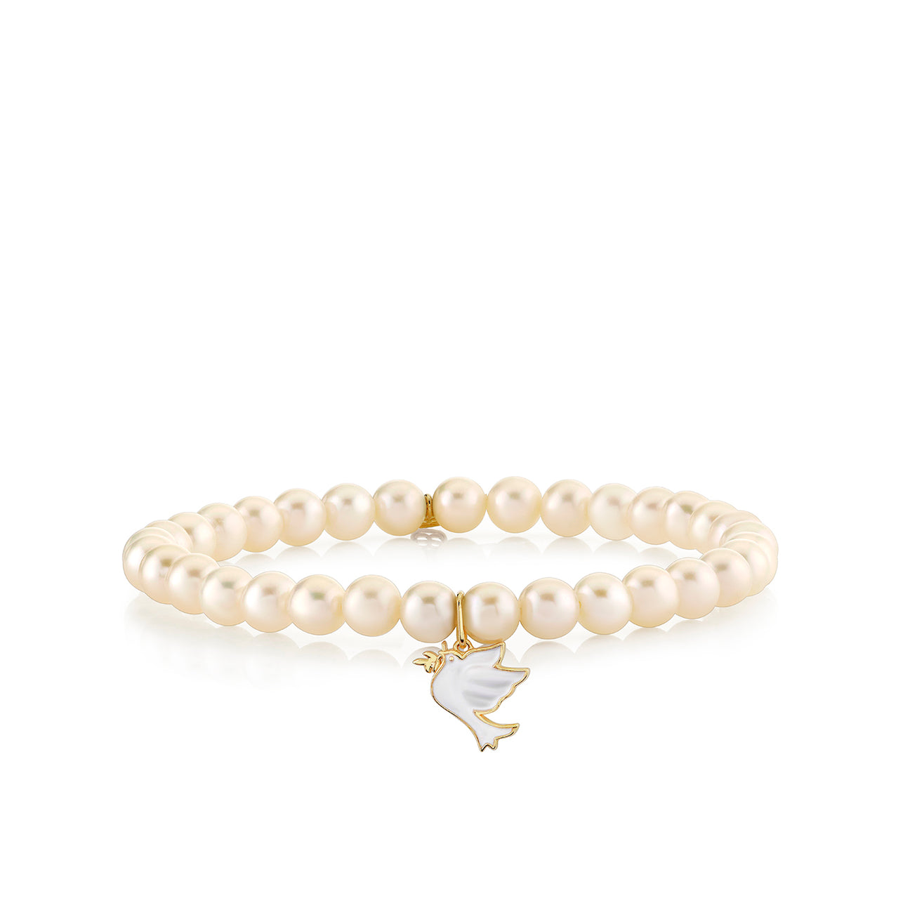 This elegant bracelet features a delicate 14k yellow gold and white enamel dove charm, symbolizing peace, freedom, and harmony, set against a backdrop of 5mm lustrous freshwater pearls. The dove, often associated with hope and new beginnings, serves as a reminder of tranquility and love.