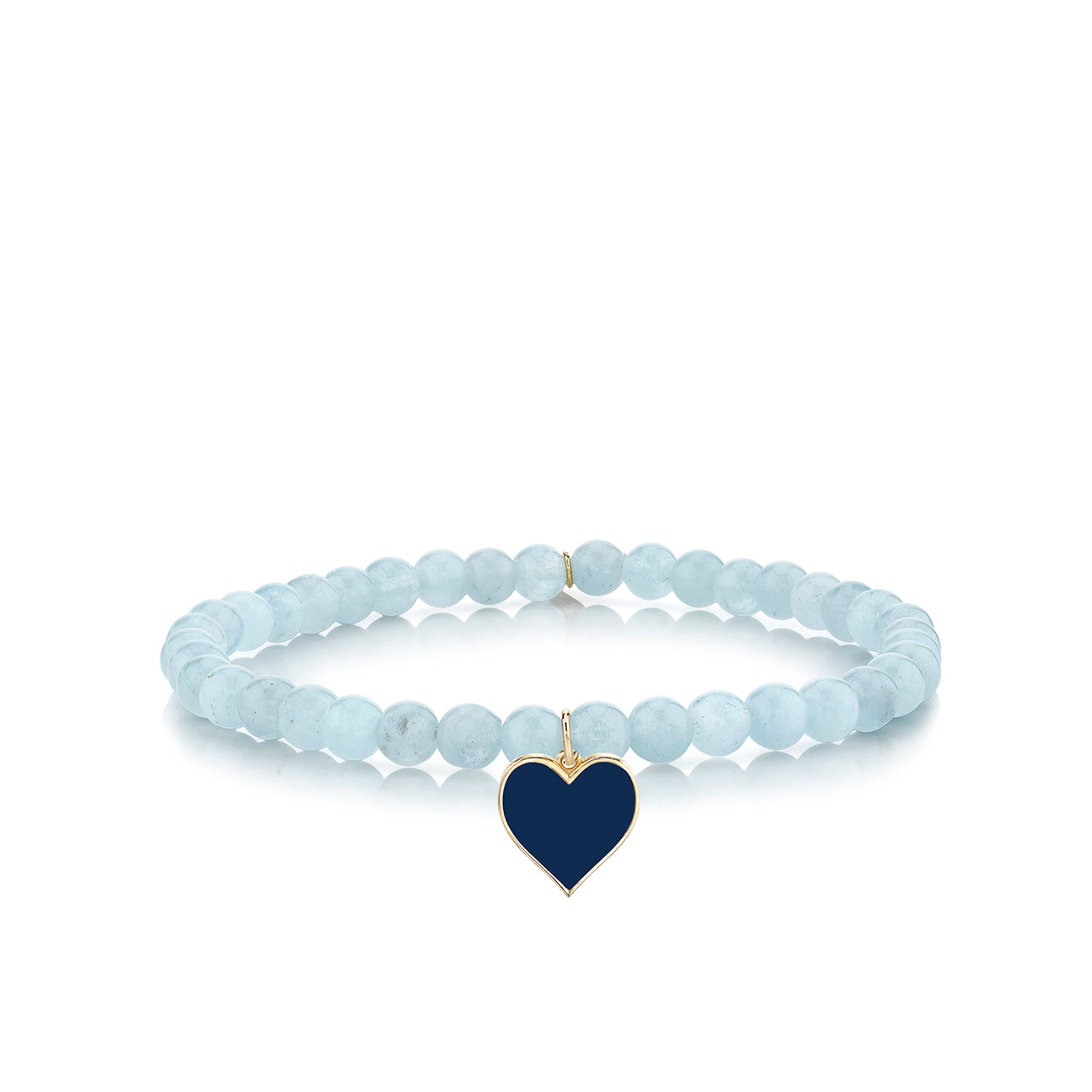 Add a touch of serene beauty with this 14k yellow gold and navy enamel small heart charm bracelet, featuring a charming heart measuring approximately 3/8″ high x 3/8″ wide. The charm rests gracefully on smooth 4mm round aquamarine beads, prized for their calming blue hues and natural elegance.