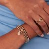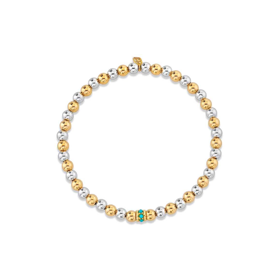 Made with 14k yellow gold and turquoise, this bracelet features a stunning scallop rondelle design on 4mm two-tone 14k gold beads. Each bracelet is carefully crafted and strung on a stretch cord, along with our signature 14k gold SE logo charm.