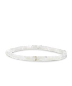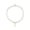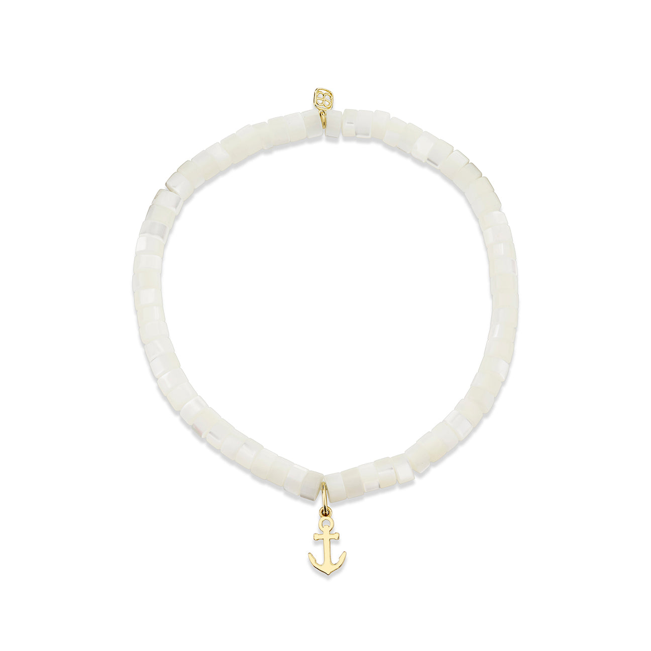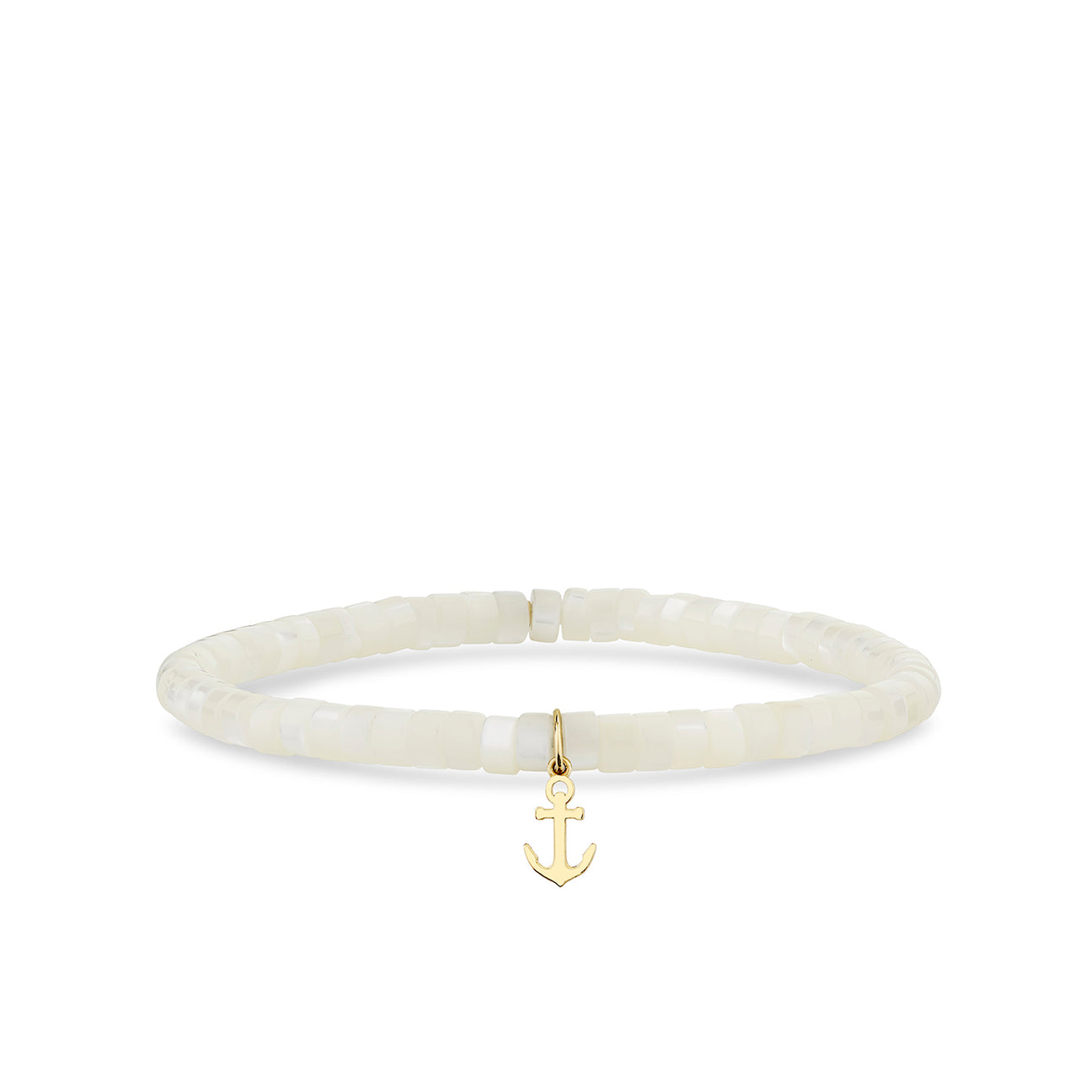 Crafted from 14k gold, this bracelet features 4mm mother of pearl heishi beads with a soft iridescent glow. A tiny solid gold anchor sits at the center, adding a subtle nautical touch to the delicate design. The contrast of luminous pearl and pure gold brings a sense of ease and refinement to this everyday piece.
