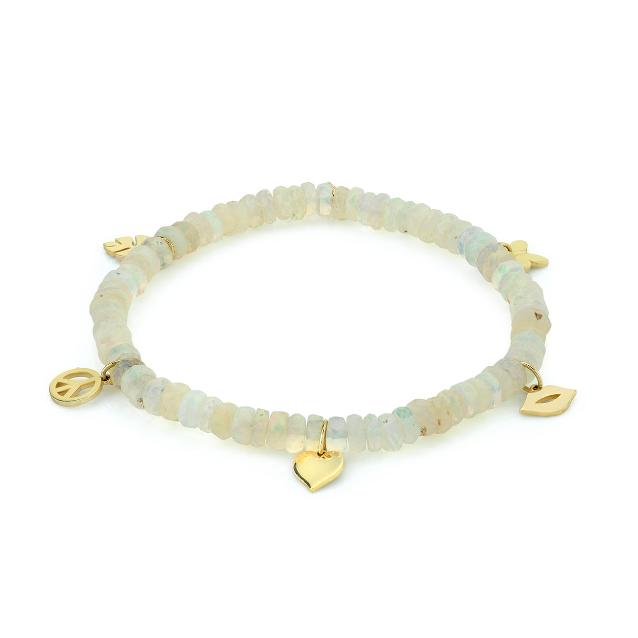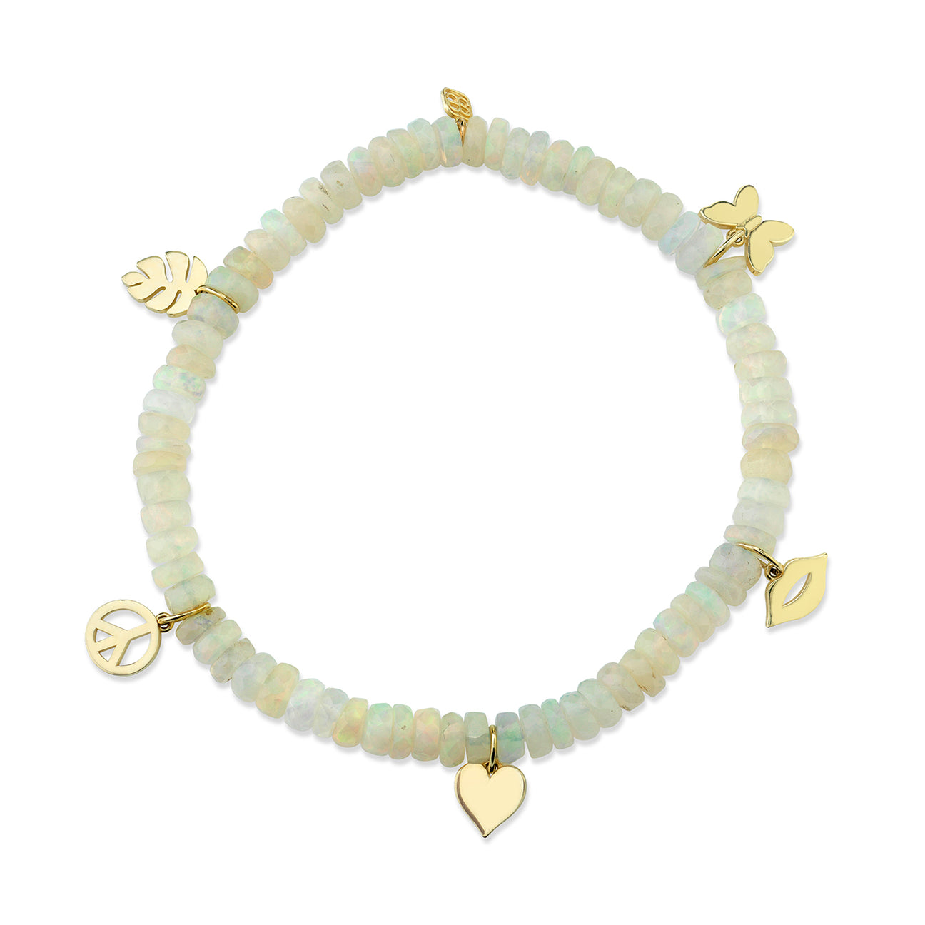 This delicate 14k yellow gold bracelet features a string of vibrant 5mm Ethiopian Welo opal beads, known for their captivating play of colors and spiritual energy. The bracelet is adorned with meaningful charms, including a monstera leaf—symbolizing growth, resilience, and connection to nature, a peace sign for harmony and unity, a heart representing love and compassion, lips for self-expression and communication, and a butterfly, a symbol of transformation and freedom. All Sydney Evan beaded bracelets are expertly strung on a durable stretch cord, finished with our signature 14k gold SE logo charm. Due to the unique nature of the precious and semi-precious stones, bead color and shape may vary slightly, adding to the individuality of each piece.