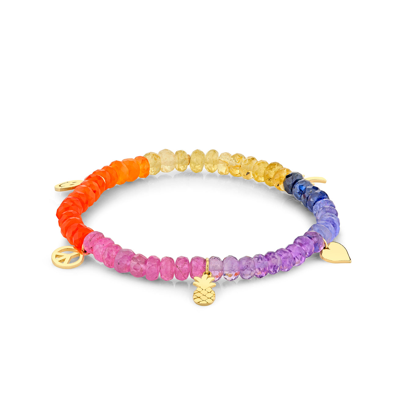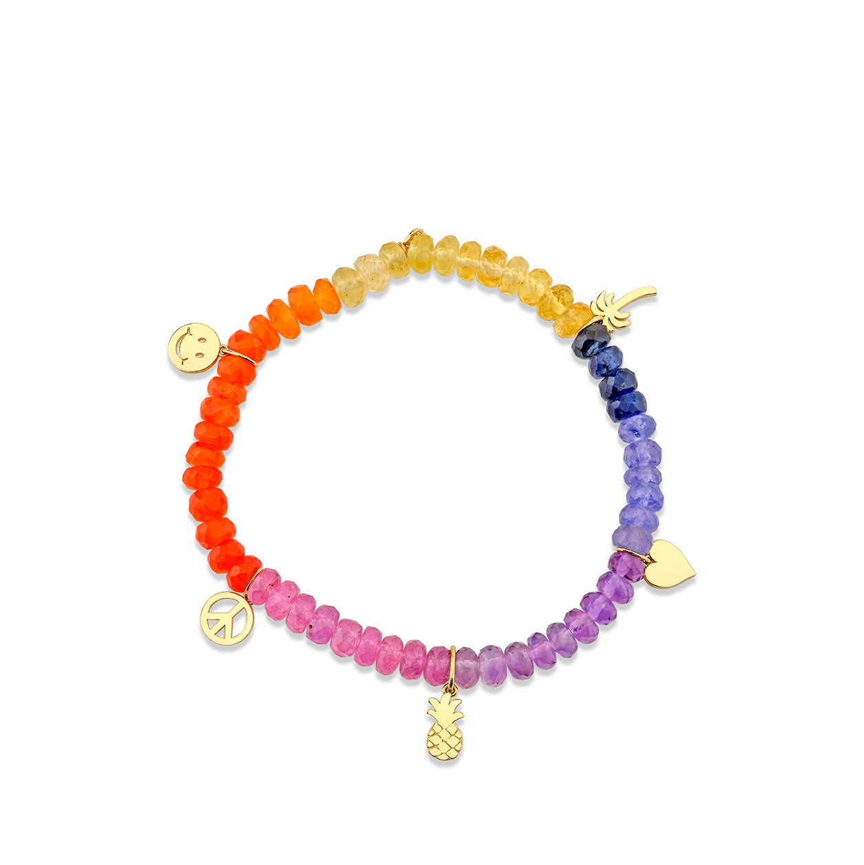 Made with pure 14k yellow gold, this bracelet features a unique combination of charms including a happy face, peace sign, heart, pineapple, and palm tree. Each charm is carefully crafted to add a touch of whimsy to the bracelet. The 5mm semi-precious faceted beads add a pop of color and texture, making this bracelet truly eye-catching. Please note that the color and shape of the beads may vary slightly due to the natural variations of the stones. This bracelet is strung on a stretch cord and includes a 14k gold SE logo charm. The standard size is approximately 6.25, ensuring a comfortable fit for most wrists. Please contact us for all custom size requests.