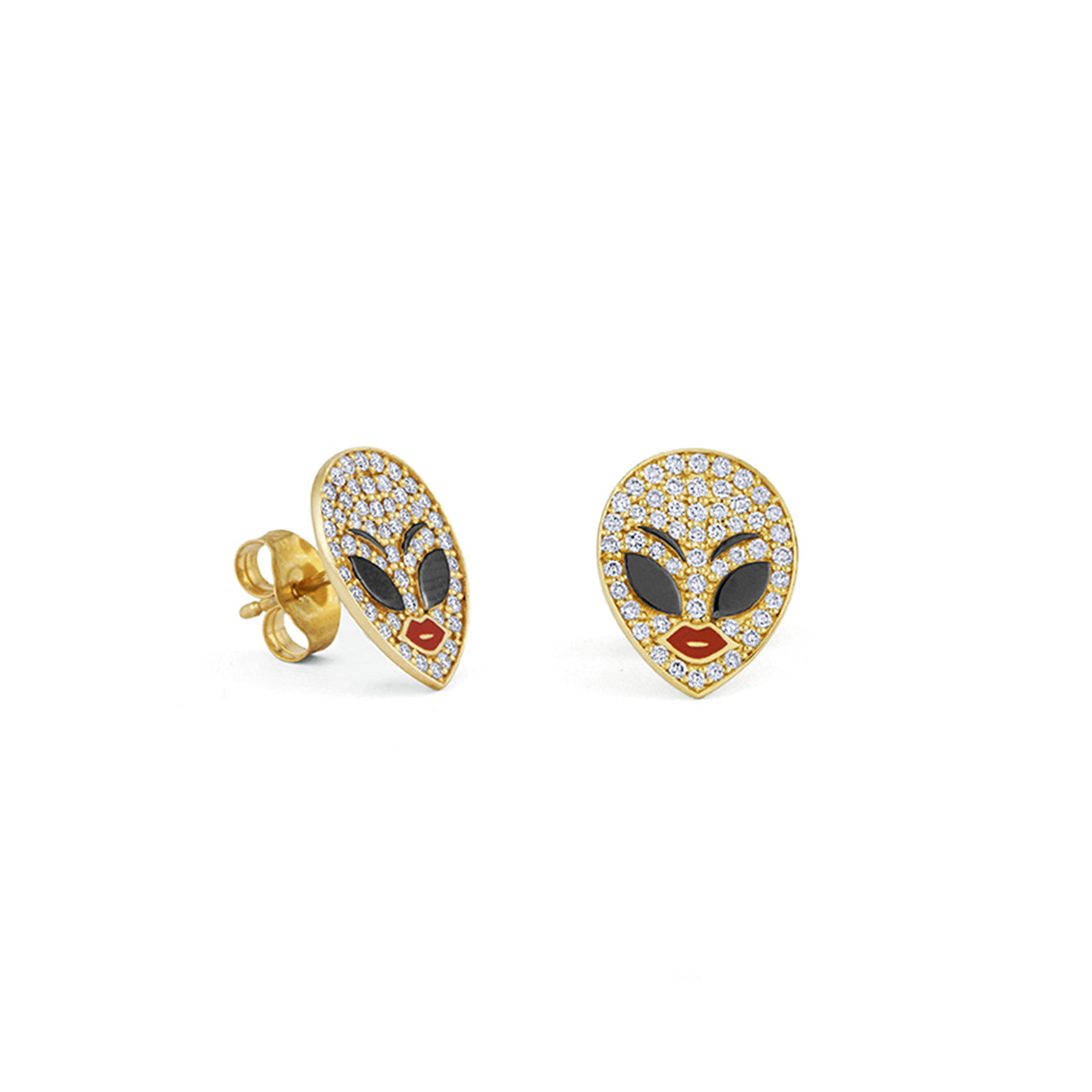 These 14k yellow gold alien stud earrings feature striking black enamel eyes and bold red lips, symbolizing the mysterious allure of the unknown and the powerful beauty of self-expression. The diamonds, nestled delicately within the design, add a touch of cosmic elegance, representing the stars that guide us through the vastness of space. Crafted with fine 14k gold posts and backs, these earrings are as durable as they are captivating, offering a unique blend of whimsical charm and refined sophistication. The studs measure approximately 1/4″ wide by 3/8″ high, making them the perfect statement piece for those who embrace the unconventional.