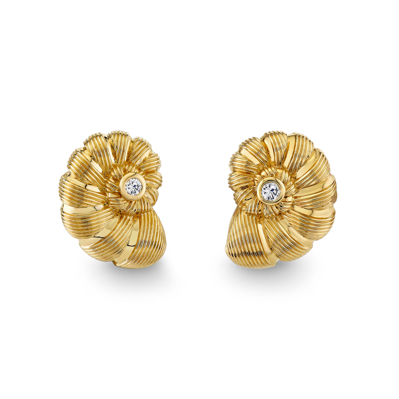 Made from 14k yellow gold, this stud features a large nautilus shell design adorned with a sparkling diamond. The fine 14k gold post and back ensure a secure and comfortable fit. The stud measures approximately 5/8’W x 3/`4’H, making it a statement piece that will elevate any outfit.
