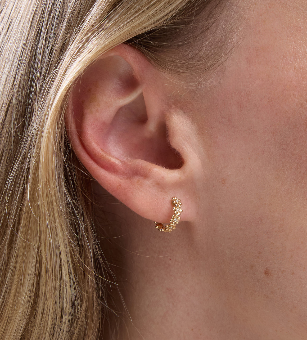 Measuring approximately 1/2″ x 1/2″, these dainty huggies hug the earlobe comfortably and securely with fine 14k gold posts. Perfect for layering or wearing solo, they’re a timeless floral statement you’ll never want to take off.