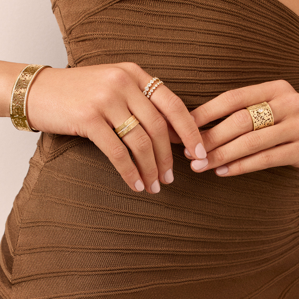 The ring features a continuous circle of dazzling 2mm bezel-set diamonds, each expertly secured within a delicate gold bezel that enhances their brilliance. These diamonds, known for their exceptional clarity and sparkle, are set in a seamless pattern that represents an infinite circle, embodying eternal commitment and the endless possibilities of your shared journey.