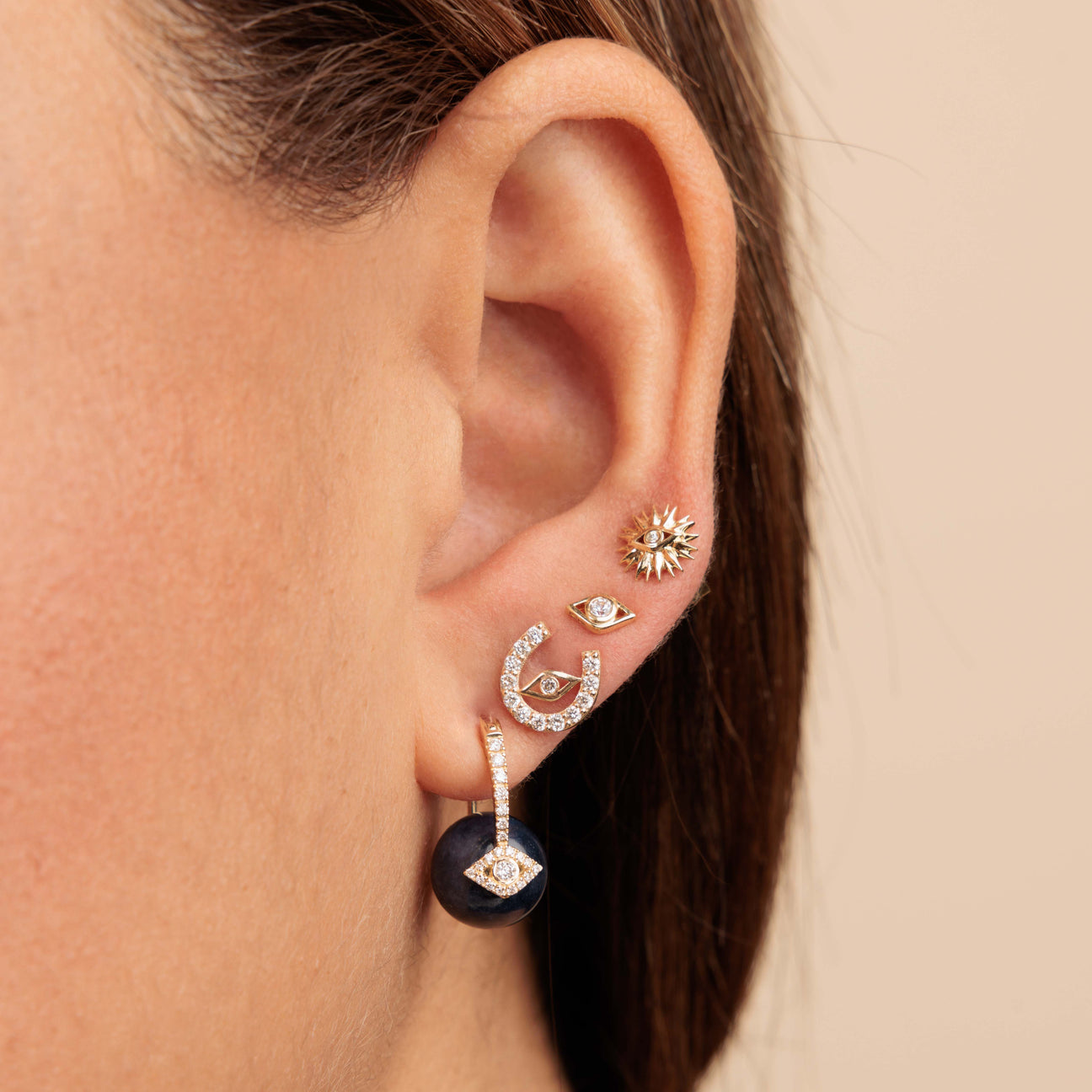 These 14k yellow gold protective eye bead earrings are designed to captivate with their powerful symbolism and timeless elegance. The pavé-set diamonds shimmer against the rich 10mm blue sapphire beads, known for their protective and calming properties. The protective eye, an ancient symbol of protection, is believed to ward off negative energy and bring good fortune to the wearer. Crafted with precision, the earrings feature a fine 14k gold hinged wire closure for a secure fit. Measuring approximately 5/8″ h x 3/8″ w, they offer a delicate yet bold statement, combining luxury with meaningful charm.
