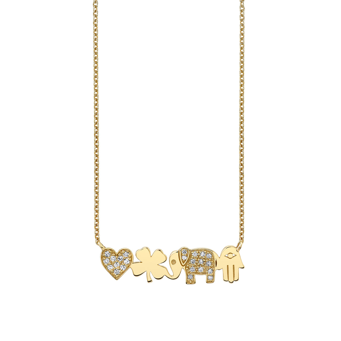 This stunning 14k yellow gold and diamond icon bar necklace is a meaningful and elegant piece that combines precious metals with symbolic charm. The necklace features a delicate diamond heart, representing love and connection; a pure gold shamrock clover, a symbol of luck and prosperity; a diamond elephant, embodying wisdom, strength, and good fortune; and a pure gold hamsa, a timeless symbol of protection and blessings. The fine 14k gold medium cable chain adjusts between 16″ and 18″, offering a customizable fit to complement any style.