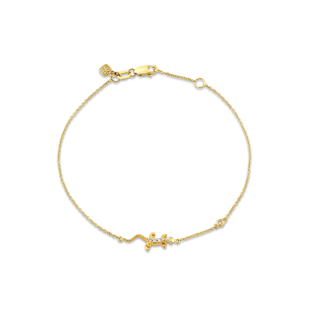 Crafted from 14k gold, this captivating bracelet features a sleek diamond-adorned lizard, symbolizing resilience and transformation. The intricate detailing and shimmering accents bring a dynamic elegance to the design, making it a bold yet refined statement piece.