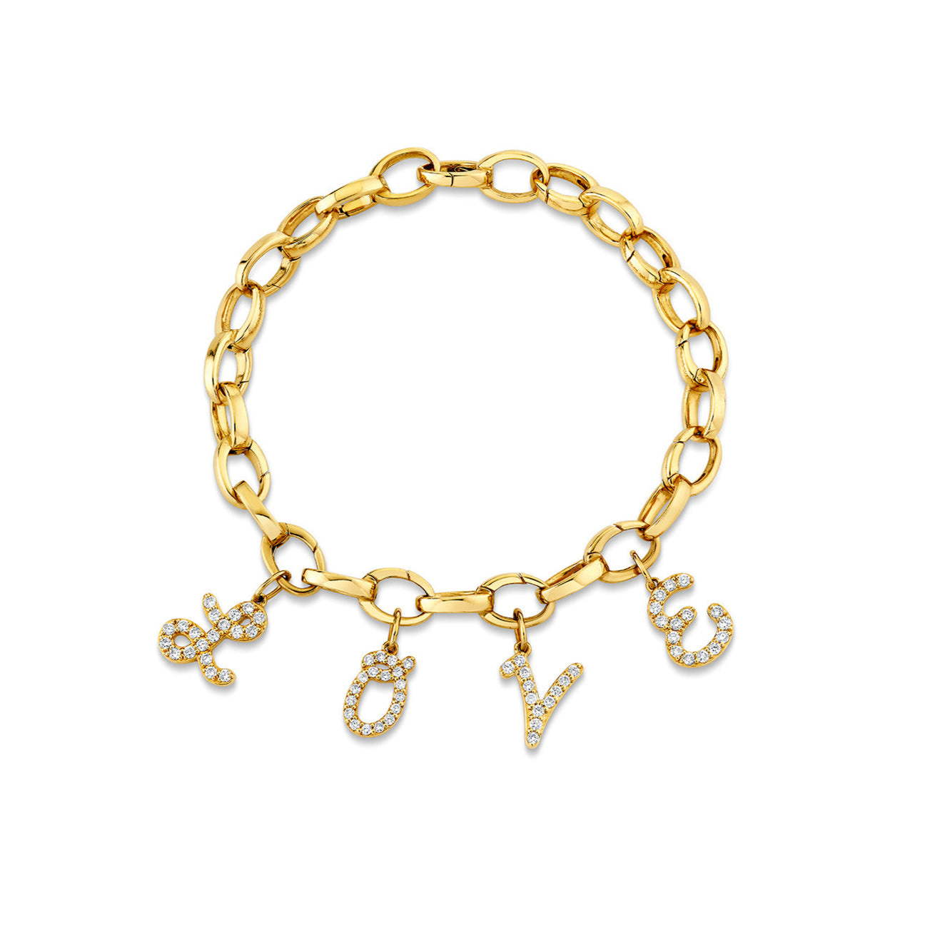 Crafted from 14k gold, this bracelet features love initials charms, each adorned with sparkling diamonds, adding a touch of elegance and sparkle. The shimmering diamonds enhance the meaningful design, making it a perfect way to express affection and personal style. With its refined gold setting and luxurious diamond details, this charm bracelet offers a timeless and sophisticated look. Ideal for gifting or as a meaningful addition to your jewelry collection, it beautifully combines sentiment with luxury, making it a standout piece for any occasion.