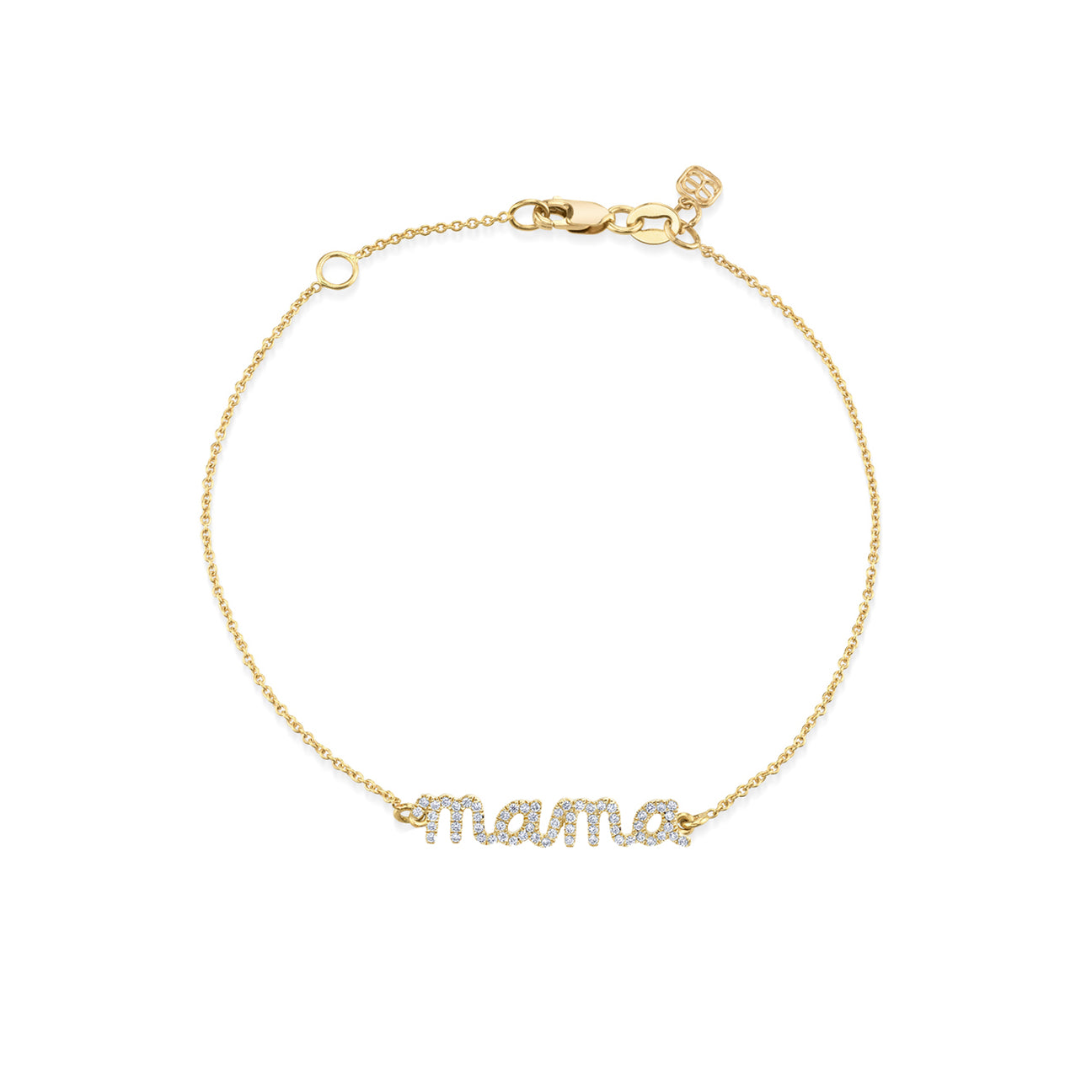 Celebrate the special bond of motherhood with this elegant 14k gold and diamond “Mama” bracelet, beautifully crafted in our signature flowing script. The delicate script measures approximately 1″ long by 3/16″ high, adorned with pavé-set diamonds that add a subtle sparkle.