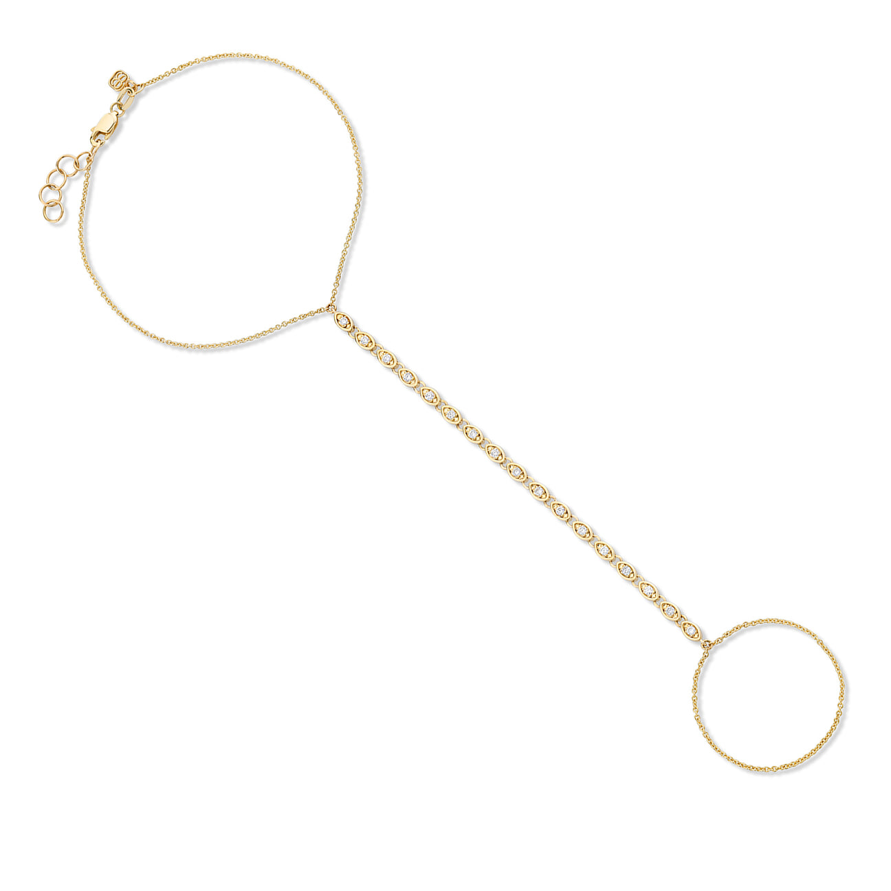 14k yellow gold princess hand bracelet with diamond marquis eyes. The length of the marquis eyes is appx. 4 5/8″ and the bracelet size is 6.75″.