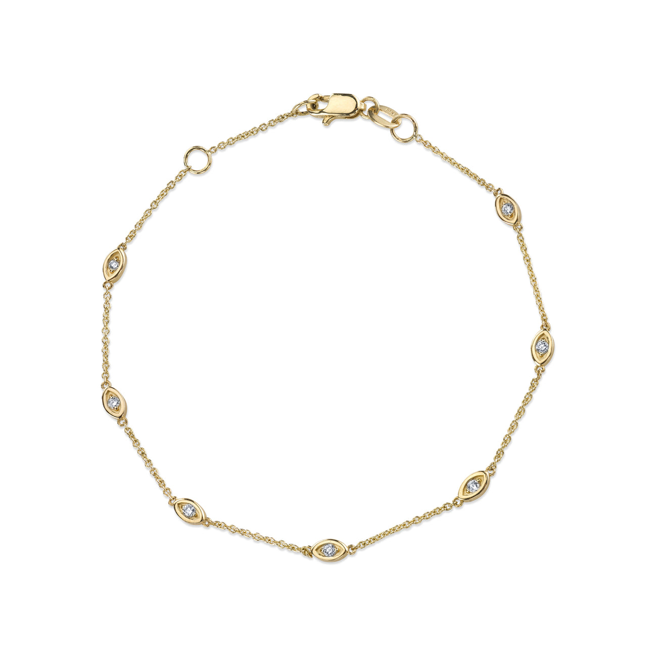 Embrace protection and style with our 14k Yellow Gold Multi Marquis Protective Eye Bracelet, featuring multiple delicate marquis-shaped eyes adorned with sparkling diamonds. Each protective eye charm measures just under ⅕” across, creating a stunning, meaningful pattern along the fine gold bracelet.