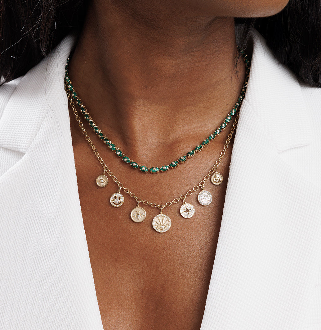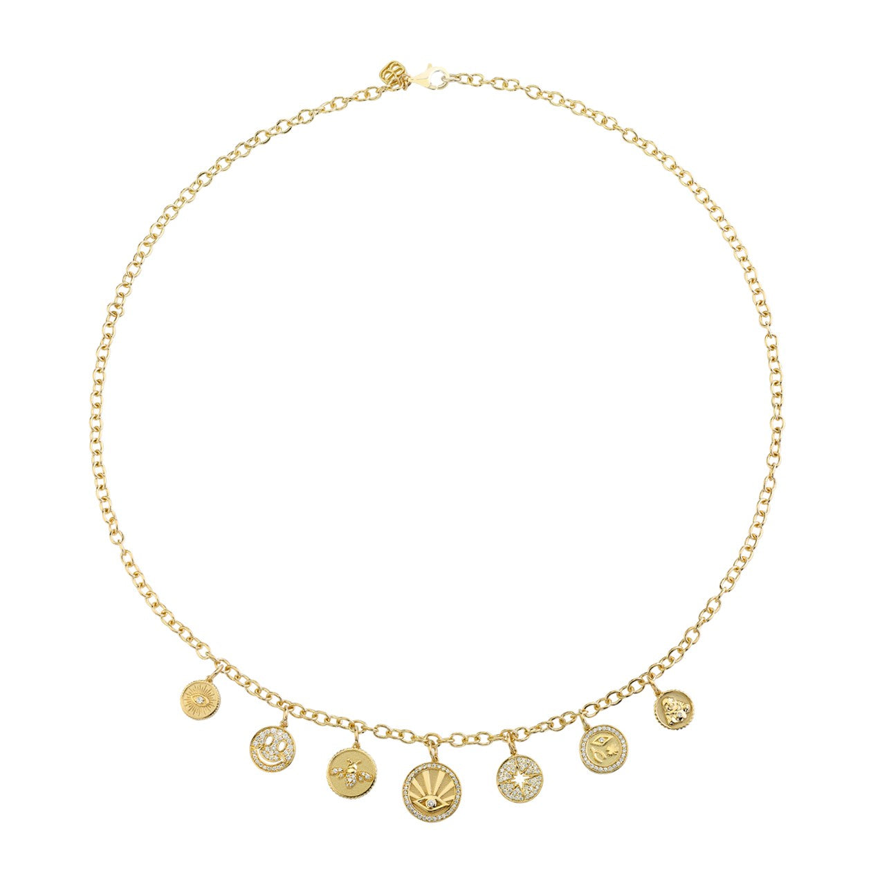 Tell your story through symbols of joy, wisdom, protection, and positivity with this radiant 14k yellow gold and diamond multi-medallion necklace. Crafted with intention and charm, this piece features a thoughtfully curated collection of seven meaningful charms, each delicately soldered onto an 18″ fine yellow gold small oval link chain for effortless elegance and all-day wear.