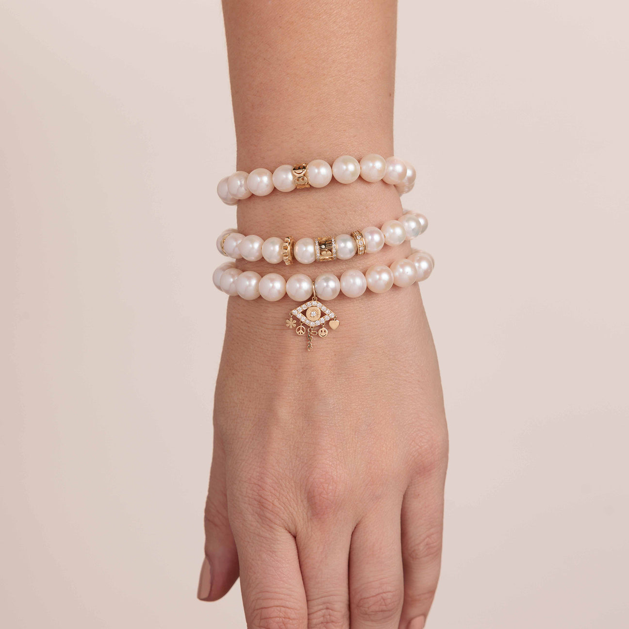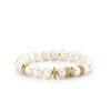 14k yellow gold multi-rondelle and 9mm potato pearl bracelet. The bracelet features one pure gold marquise eye rondelle, one pure gold scallop rondelle, one diamond luck icon rondelle and one diamond rondelle. All Sydney Evan beaded bracelets are strung on a stretch cord along with our 14k gold SE logo charm. Beads color and shape may vary slightly due to the nature of the precious and semi-precious stones. Standard size is approximately 6.25″, for all custom size requests, please contact us.|+Care Instructions