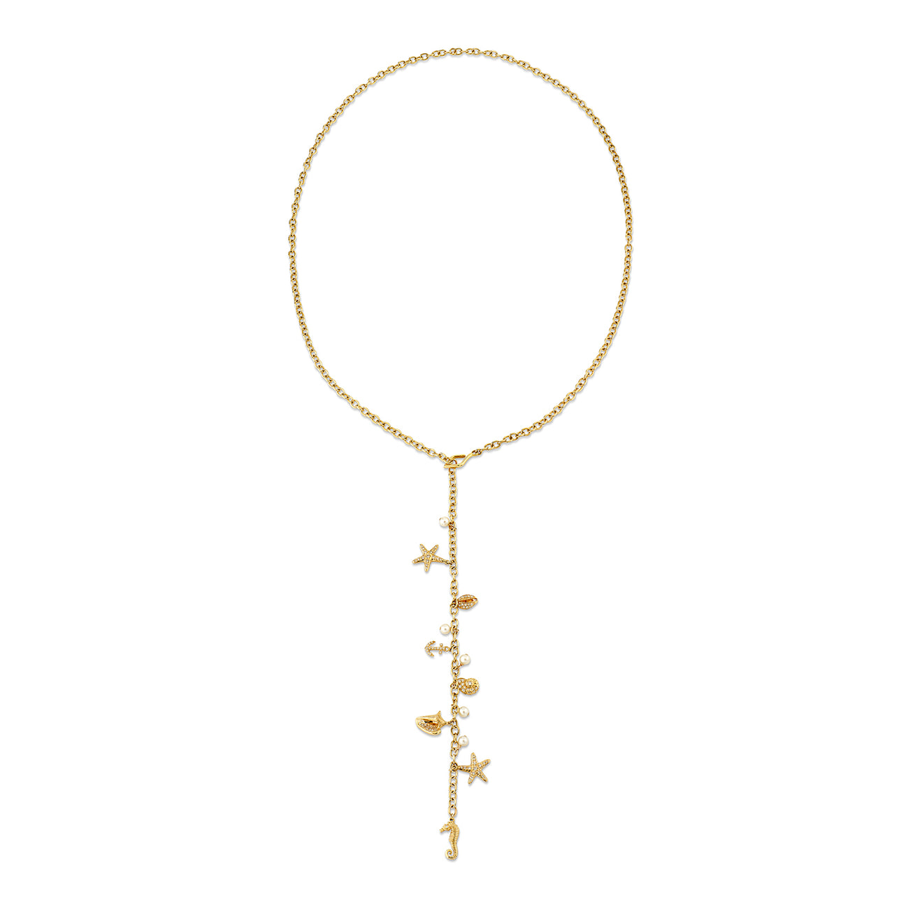 Crafted from 14k gold, this drop necklace brings together a playful mix of ocean-inspired charms in a beautifully layered silhouette. It features a small seahorse, conch shell, spiral shell, cowrie shell, tiny anchor, and two starfish charms, all suspended from an eye-shaped hook. Five delicate 4mm pearl drops add a soft luster, enhancing the coastal charm of the piece with a refined, whimsical touch.