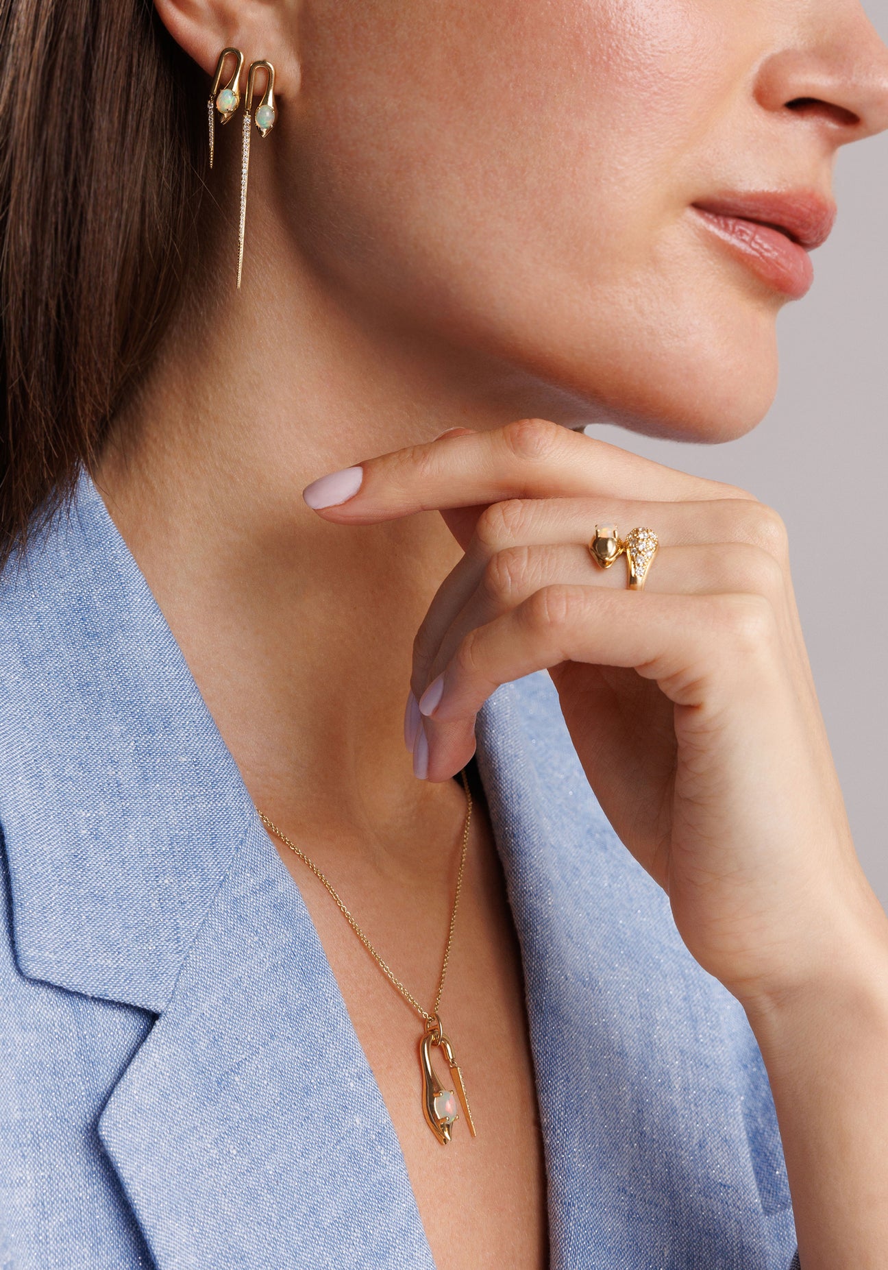 Crafted from 14k gold, this mesmerizing design combines the enchanting glow of opal with the brilliance of diamonds for a striking, elegant look. The fluid form creates a sense of movement, while the contrast between the opal’s shifting hues and the diamonds’ radiant sparkle adds depth and intrigue. Bold yet refined, this pair embodies transformation and allure, making it a captivating addition to any collection.