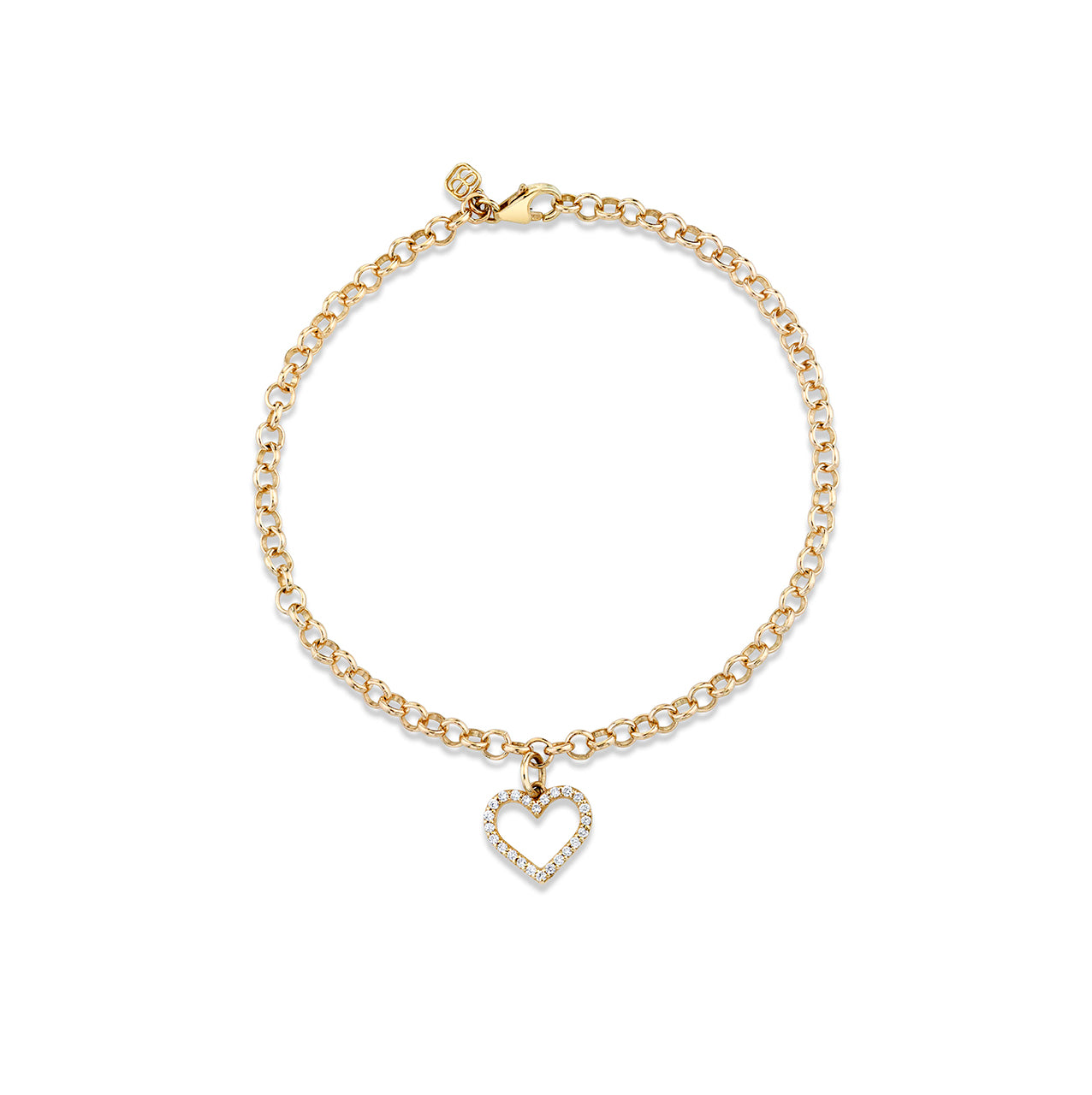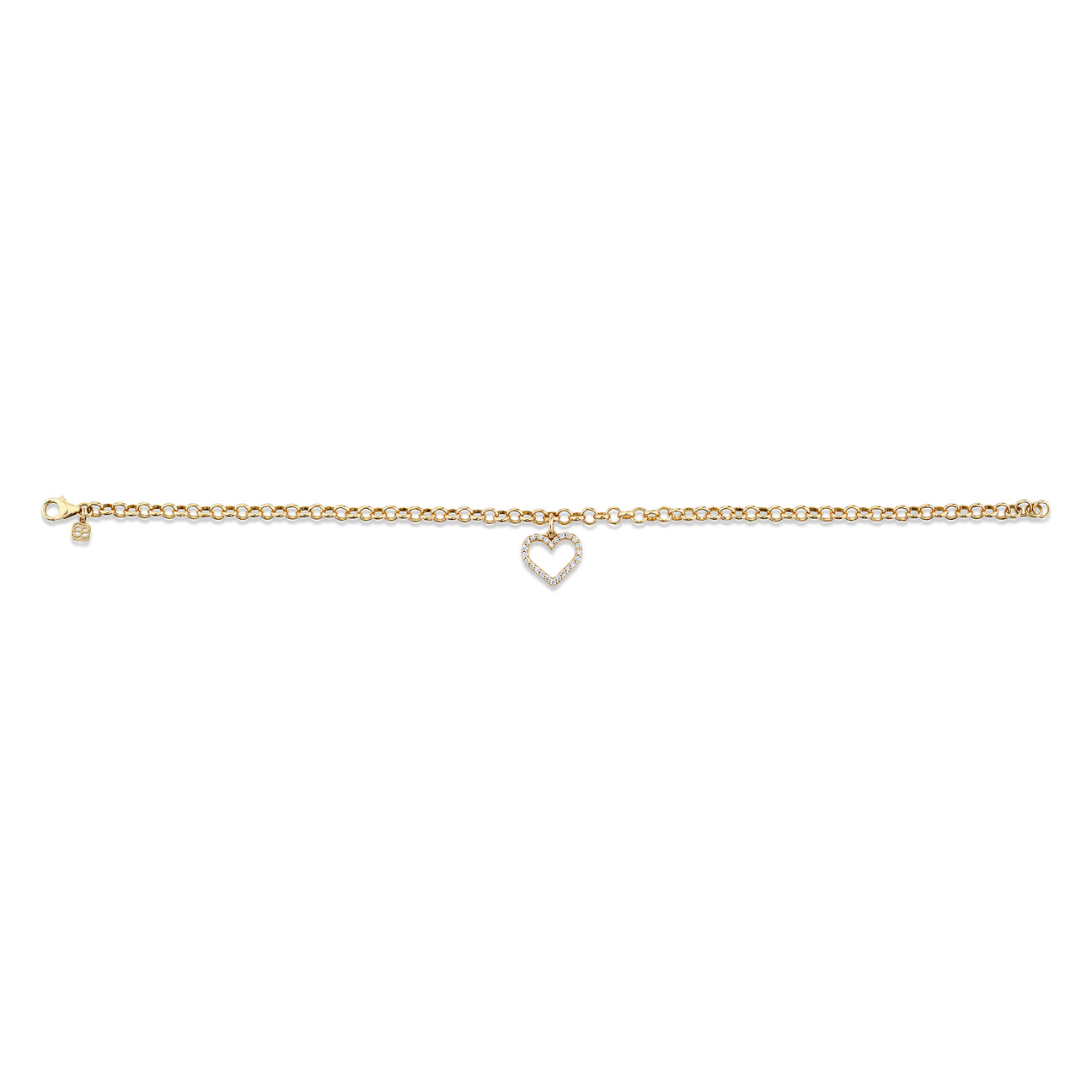 14k yellow gold and diamond open heart charm bracelet. The heart is soldered on a 14k yellow gold small rolo chain. Bracelet is 7″ in total length.