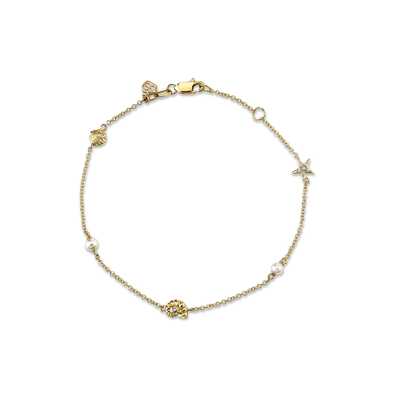Made with 14k yellow gold, this bracelet features a beautiful combination of a clam shell, a nautilus shell, and a starfish, all adorned with sparkling diamonds and lustrous pearls. The 14k gold medium cable chain adds a delicate and sophisticated touch to the overall design.