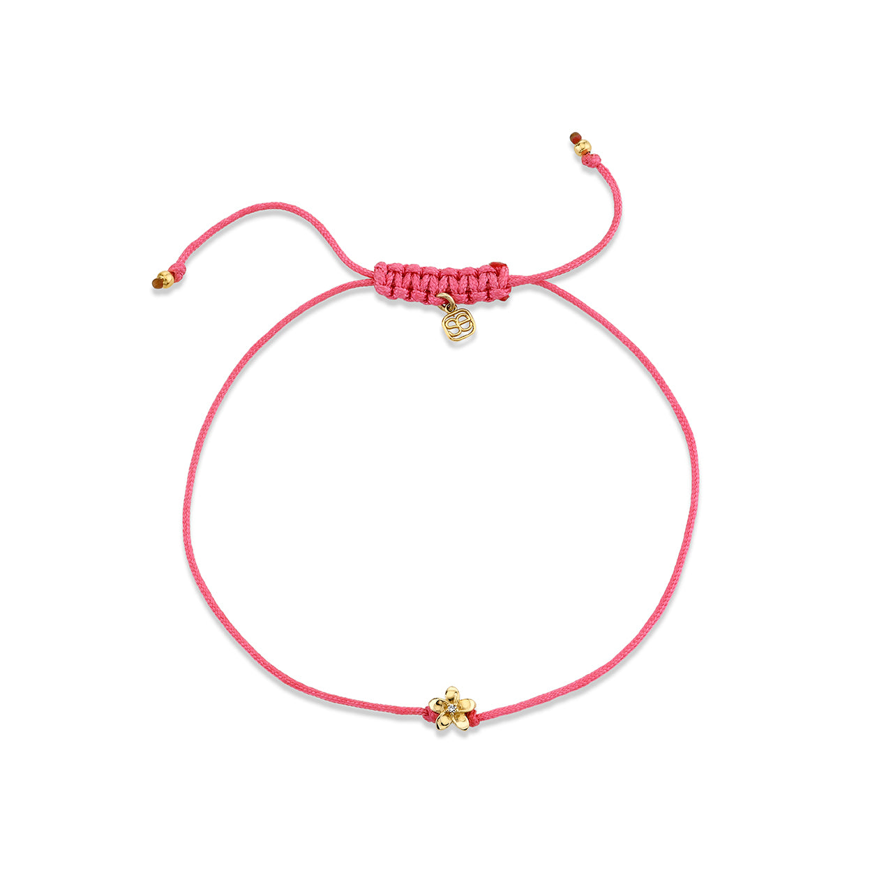 This vibrant pink silk cord bracelet showcases a stunning 14k yellow gold plumeria flower bead charm, adorned with diamond. The charm’s intricate design and sparkling details add a touch of elegance to this playful and stylish bracelet. All Sydney Evan cord bracelets are strung on an adjustable silk cord along with our 14k gold SE logo charm.