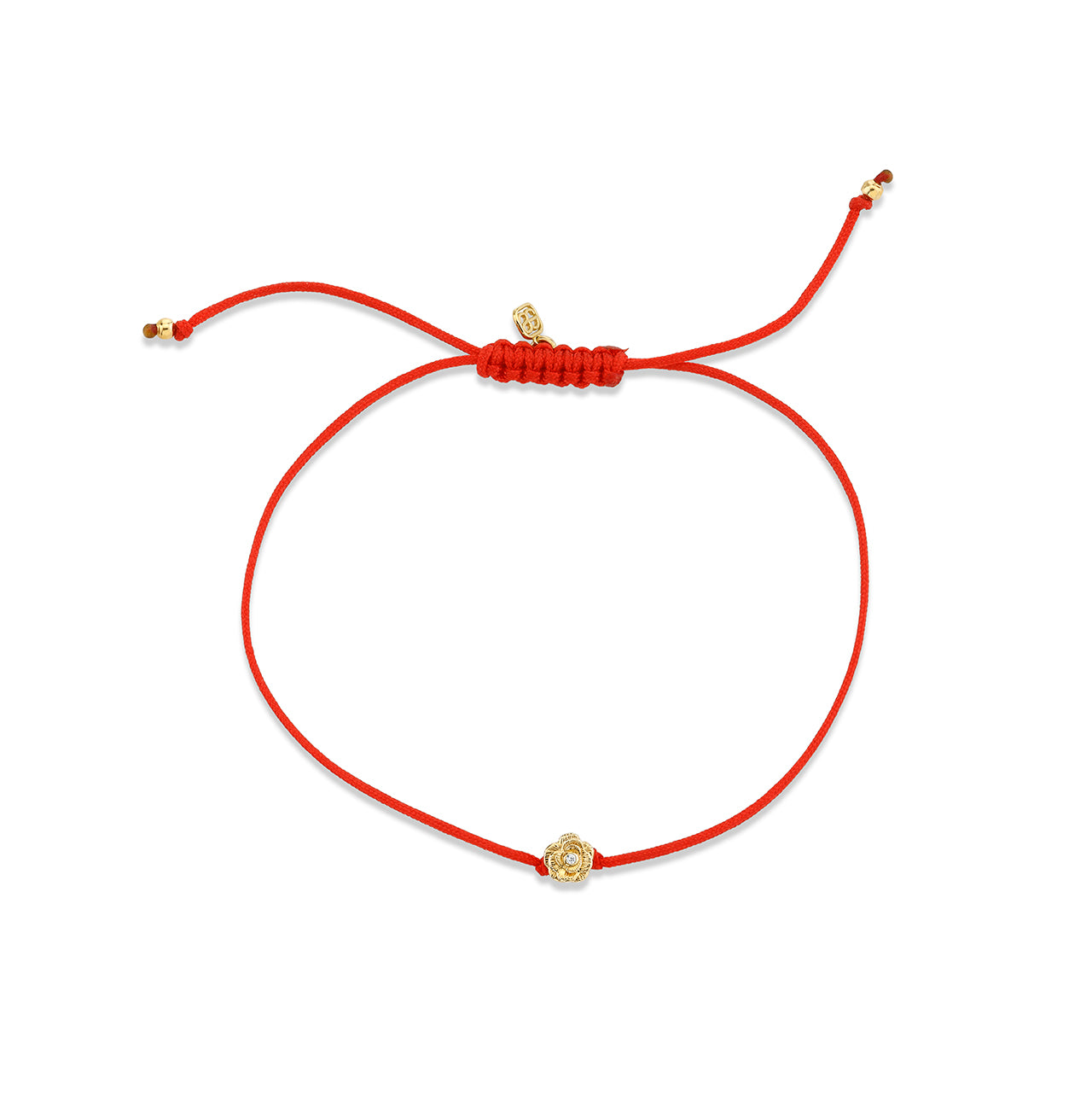 Red silk cord bracelet features a 14k yellow gold and diamond rose flower bead charm. Charm measures approximately 1/8W x 1/8H. All Sydney Evan cord bracelets are strung on an adjustable silk cord along with our 14k gold SE logo charm.