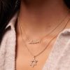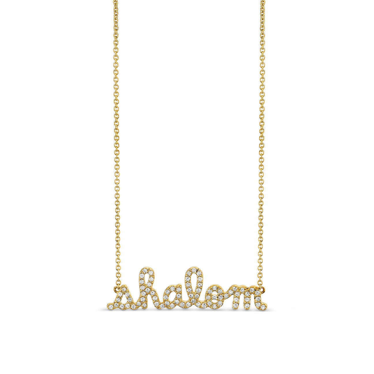 Crafted from 14k yellow gold and adorned with sparkling diamonds, this necklace features the word ‘Shalom’ written in elegant script. The fine 14k gold cable chain adds a delicate touch to the overall design, making it perfect for everyday wear or special occasions.
