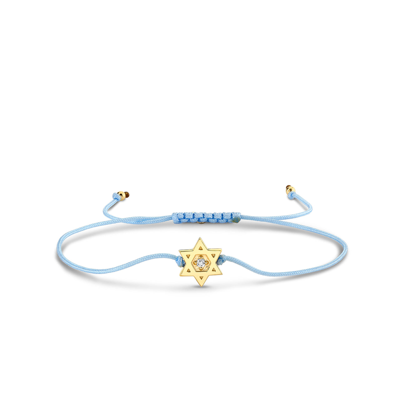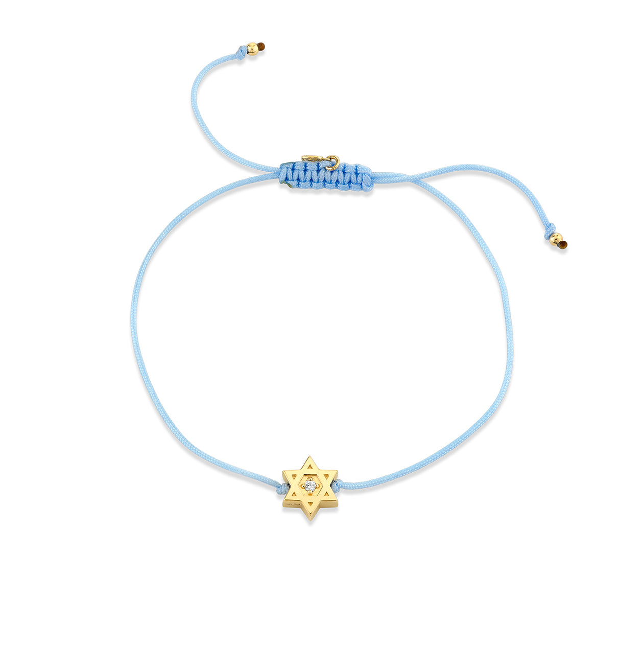Made with a delicate blue silk cord, this bracelet features a stunning 14k yellow gold and diamond Jewish star bead charm. The charm measures approximately 3/8’W x 3/8’H.