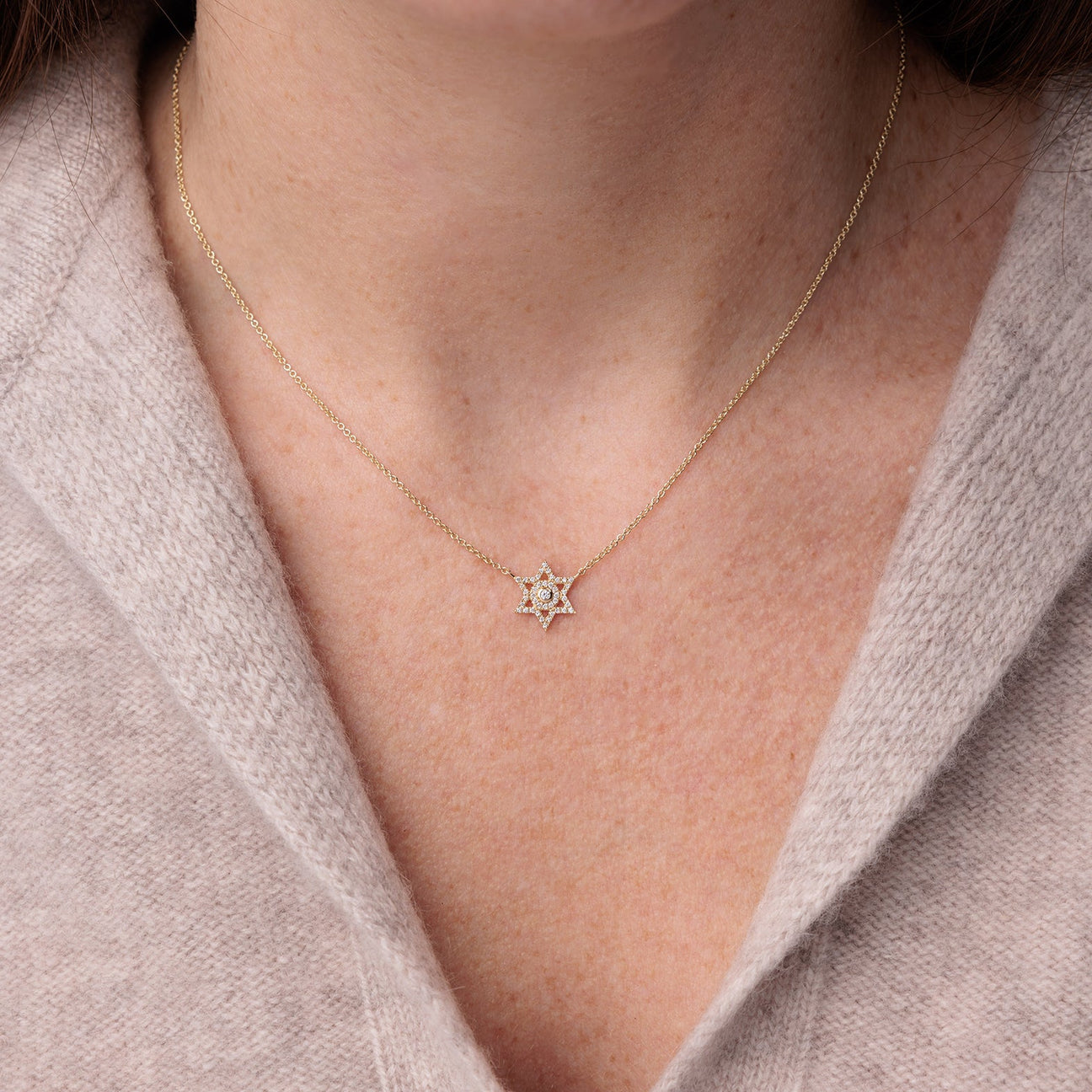 The combination of gold and diamonds creates a luxurious and eye-catching look that is sure to make a statement. The intricate design of the star of David adds a touch of elegance and symbolism to this necklace, making it a meaningful piece for those of the Jewish faith.