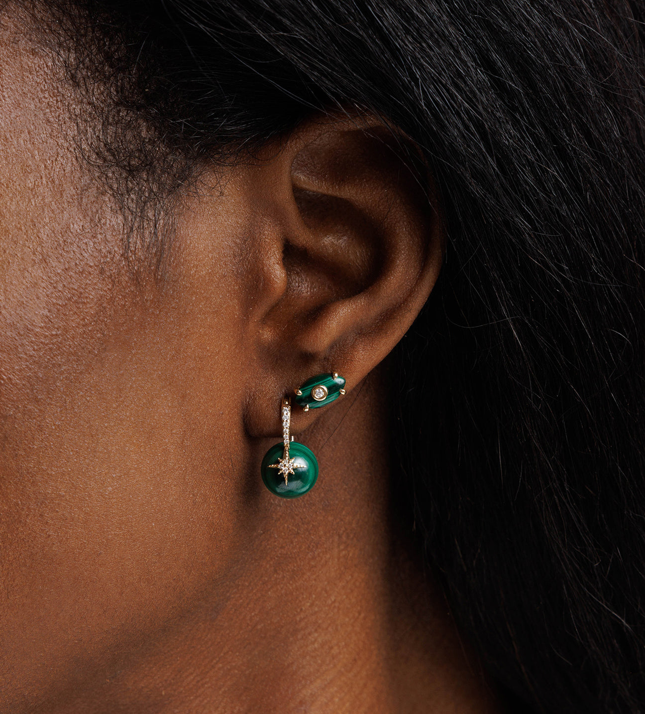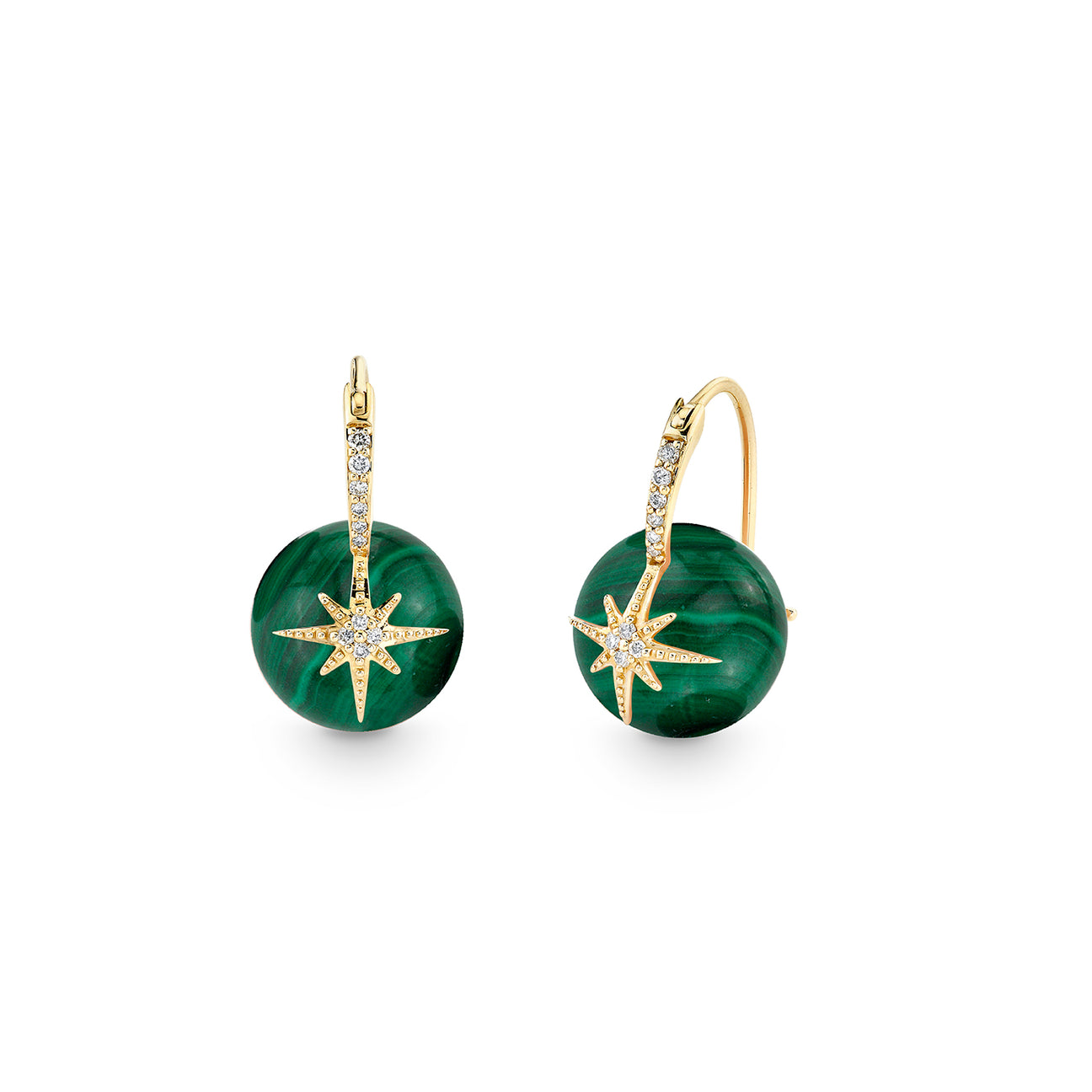 These 14k yellow gold starburst bead earrings radiate celestial charm, blending timeless elegance with symbolic meaning. Each earring showcases a dazzling starburst motif, pavé-set with sparkling diamonds, symbolizing hope, guidance, and brilliance. At the center, vibrant 10mm or 12mm malachite beads add a touch of natural beauty, their swirling green patterns representing growth, transformation, and protection. Measuring approximately 5/8″ in height by 3/8″ in width, these earrings are lightweight yet striking. A fine 14k gold hinged wire closure ensures both security and comfort, making them a luxurious statement piece for any occasion.