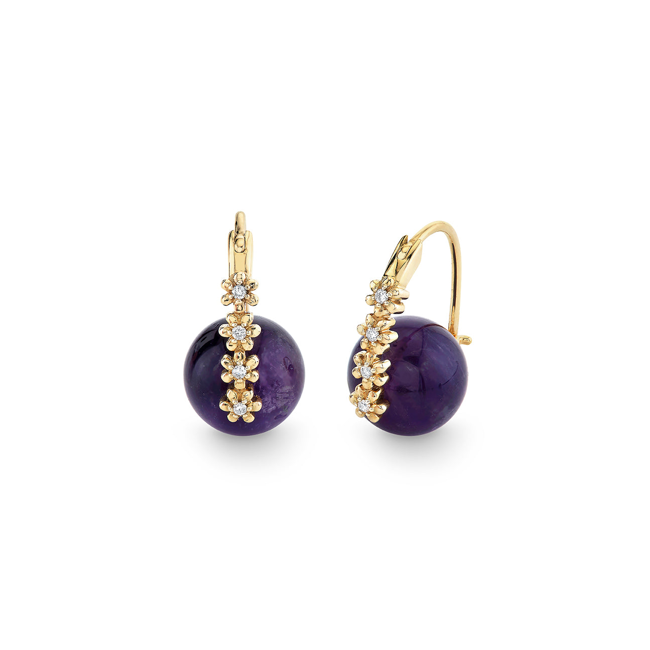 14k yellow gold tiny daisy bead earrings feature pavé-set diamonds with 10mm amethyst beads. Measure approximately 5/8″ h x 3/8″ w. Fine 14k gold hinged wire closure.