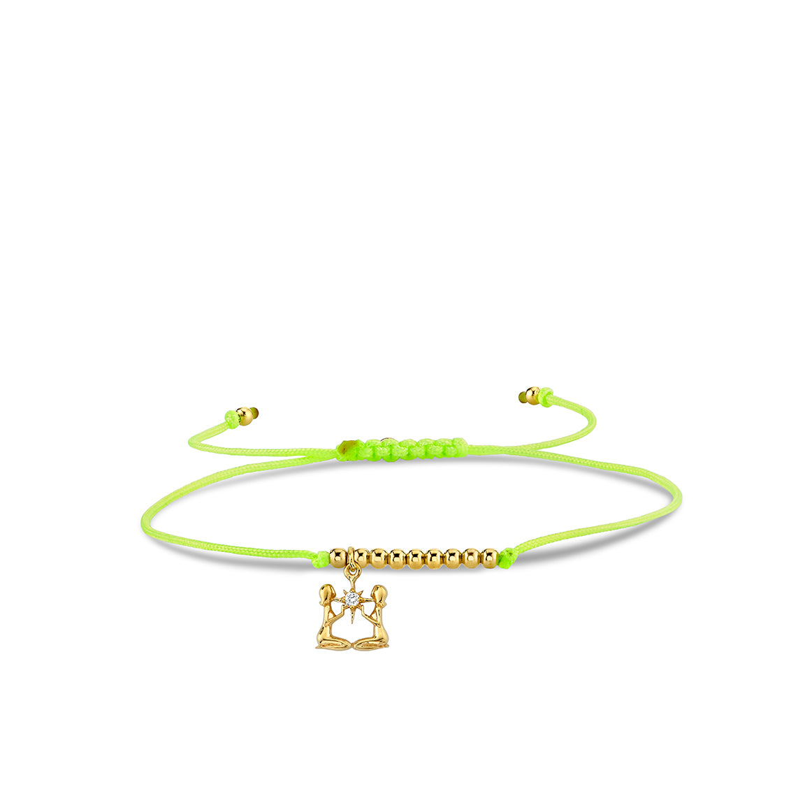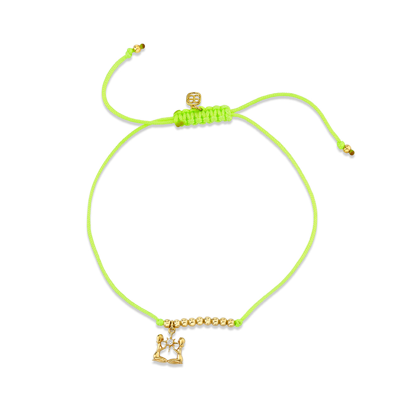Embrace the cosmos with this exquisite Gold Diamond Tiny Gemini Zodiac Cord Bracelet. Designed to captivate, this bracelet features a vibrant Neon Yellow silk cord that symbolizes energy and positivity. The cord is adorned with radiant 14k yellow gold beads, adding a touch of luxury and sophistication.