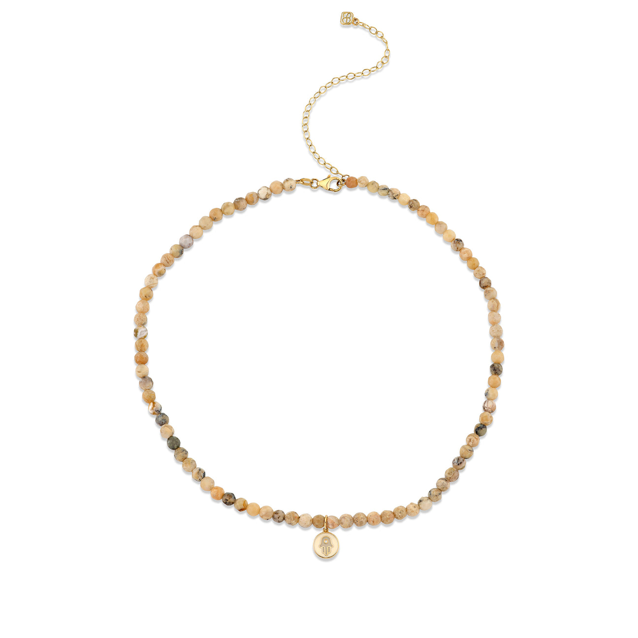 The intricate design of the hamsa, a symbol of good luck and protection, is enhanced with beige and cream enamel, adding a touch of warmth and beauty to the piece. The medallion is suspended on a necklace of 4mm African opal beads, each one unique in its own natural beauty.