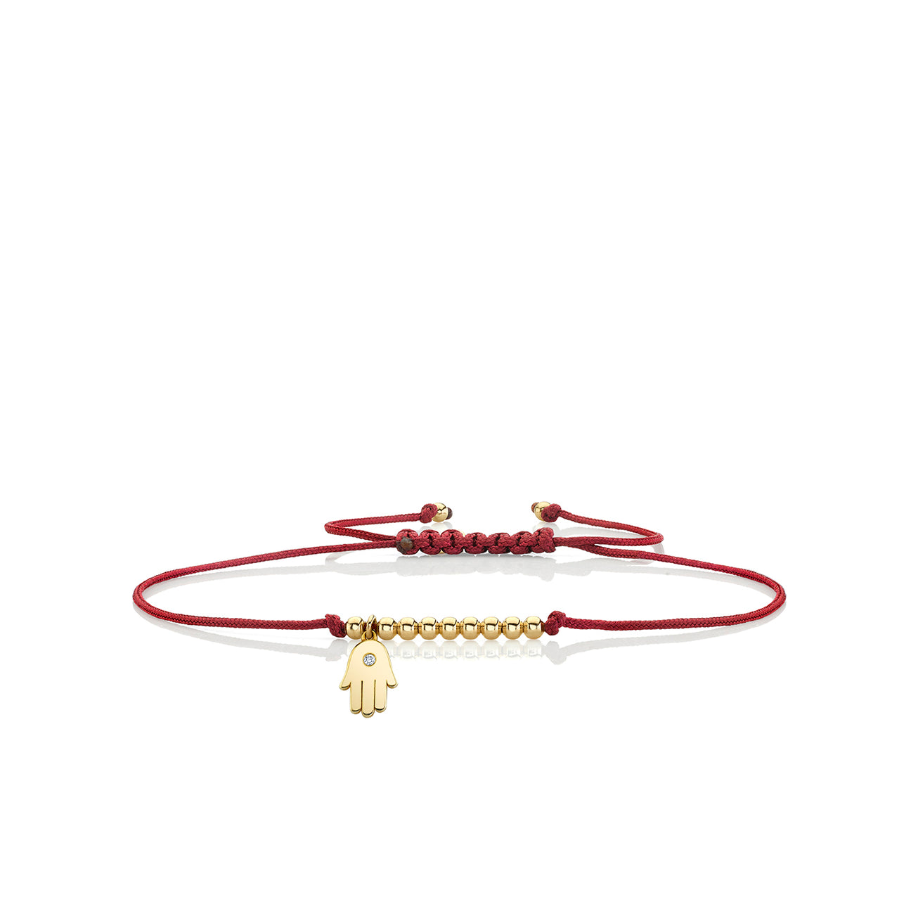 Harness the protective energy of the Hamsa with this striking red garnet silk cord bracelet. Featuring polished 14k yellow gold round beads and a delicate yellow gold tiny Hamsa charm adorned with pavé-set white diamonds, this bracelet blends vibrant color with timeless symbolism. The Hamsa is revered as a powerful talisman for protection and good fortune.