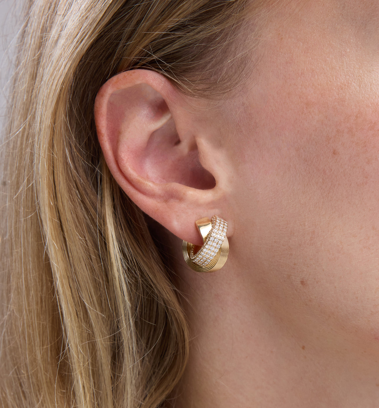 Crafted from 14k gold, this pair of hoop earrings features three interlocking rings linked in a sculptural silhouette, with pavé diamonds adding a soft shimmer. The mix of gold and subtle sparkle creates a refined design that moves with you. These hoops bring elegance and dimension to any look, making them an effortless everyday statement.
