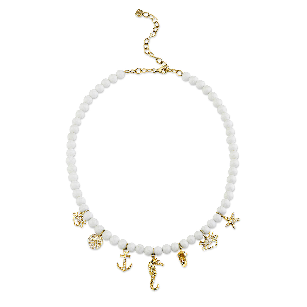 Each charm dazzles with pavé-set diamonds, beautifully strung on an 18″ necklace made of 6mm sea clam beads, complemented by a 3″ chain extender for a total adjustable length of 21″. This necklace blends whimsical marine motifs with luxurious craftsmanship, perfect for layering or making a statement on its own.